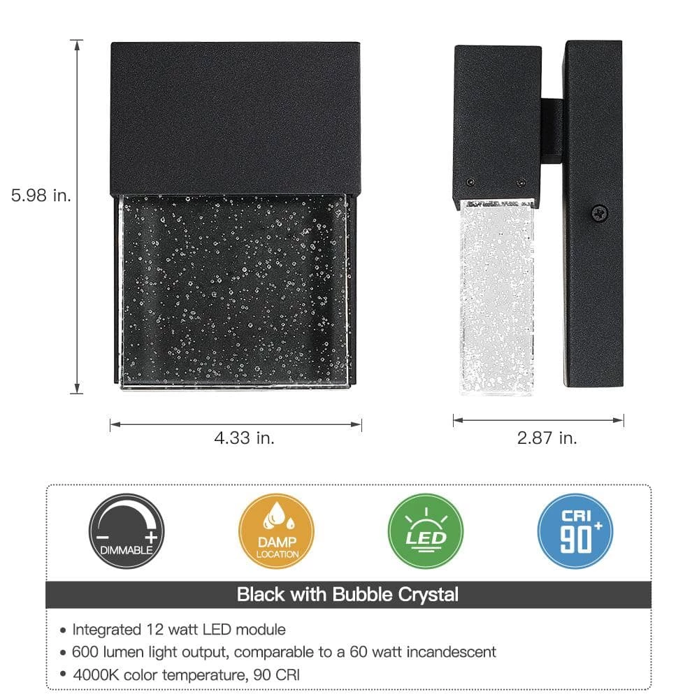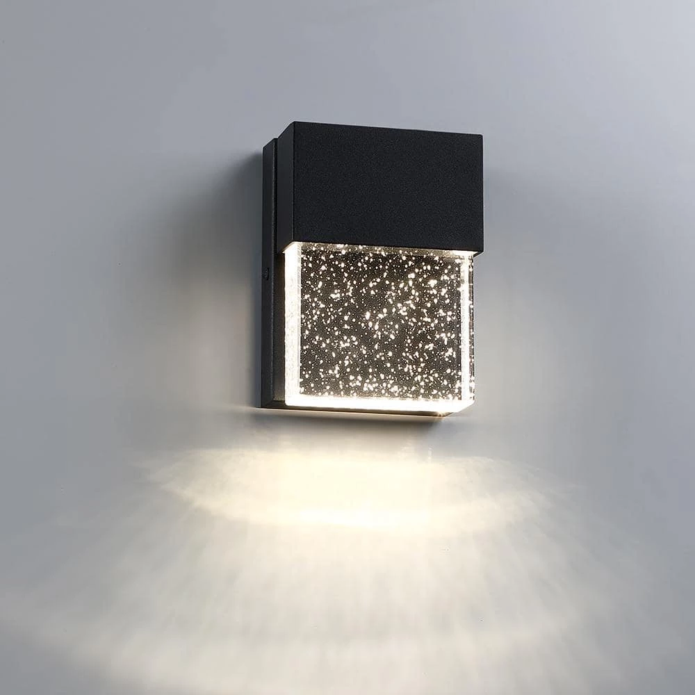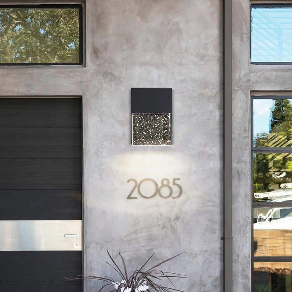 The modern LED Outdoor Wall Sconce is made of solid block of crystal glass infused with tiny bubbles to create a contemporary and industrial outdoor lighting option. Powered with modern LEDs, this sleek fixture uses far less energy than conventional bulbs and bring a sophisticated, modern look to illuminate your outdoor space with a gentle glow. This fixture is easy to install, maintenance free, can be used indoors or as an outdoor wall sconce for Front Porch, Entry light, Patio, Garage, Deck, Balcony, also good as indoor wall sconce. Also available in 10.5 in. high version.