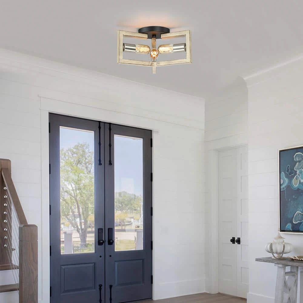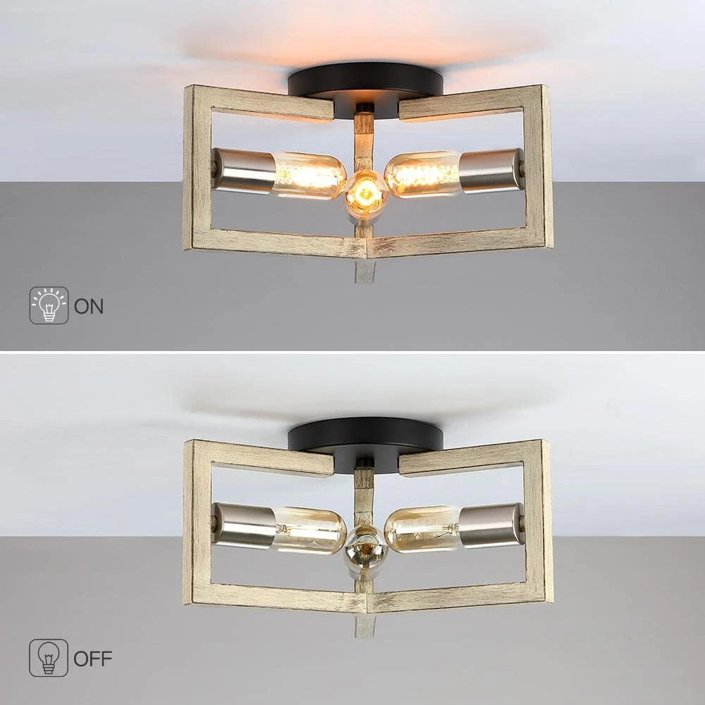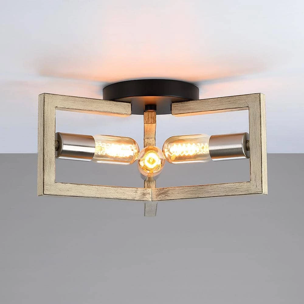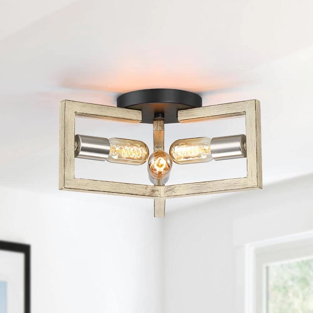 Enhance a living area or bedroom with the modern farmhouse appeal of this modern ceiling light. The geometric open cage design features 3 square frames in painted wood accent, while the brushed nickel cups add a modern flair which completes the look. Vintage style Edison bulbs (not included) are recommended for this farmhouse-rustic style fixture which is an ideal selection for hallway, entryway, stairway, door way, closet, pantry, kitchen, sitting room or a foyer to bring warmth to a living room or bedroom.