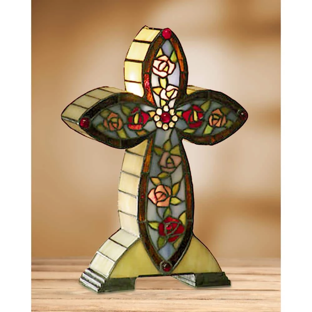 Red and pink roses are featured on the Flaura Accent Cross accent lamp. Art glass edges trim the cream body panels and will glow brilliantly when the lamp is lit. The accent lamp is beautifully embellished with red jewels for added color. This accent lamp a perfect choice for end tables, nightstands, dressers or anywhere that requires that little something special.