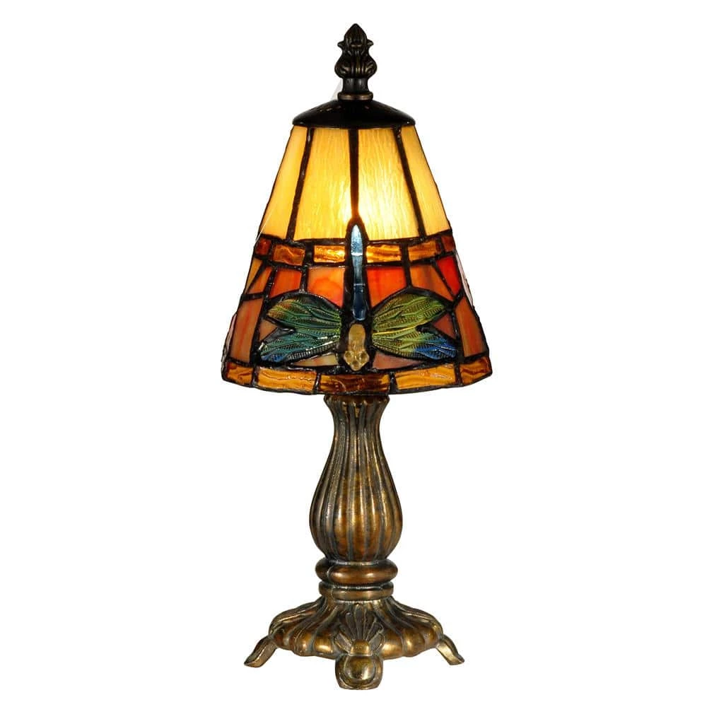 A modern twist on a classic Tiffany design, our Cavan accent lamp will glow brightly in any room in your home. The top of the cone shade is sunny amber art glass panels. A broad band of fiery orange, red and dark amber runs along the bottom edge. Large dragonflies with cool, iridescent blue green bodies and light amber heads provide crisp contrast to the warm earthen tones. The elegant metal base features a receded column and intricately cast pedestal with fan detailing. Cavan easily accents any decor style and will add a bright splash of color o your home or office for many years to come.