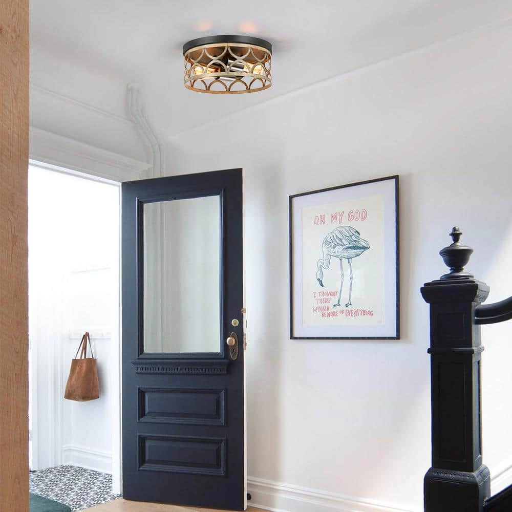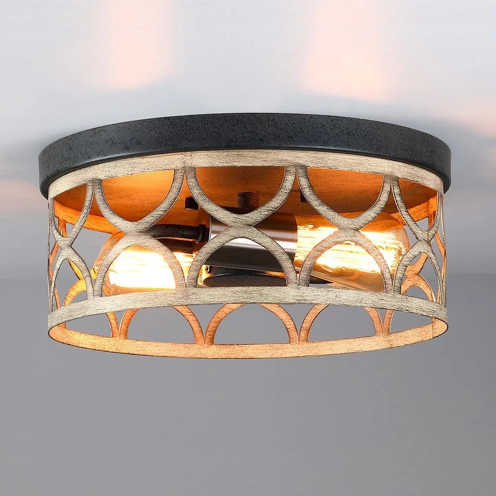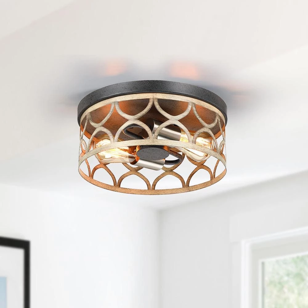 Enhance a living area or bedroom with the modern farmhouse appeal of this rustic flush mount ceiling light. It features a metal pan in a bronze finish and a laser-cut patterned frame in painted wood accent, while the brushed nickel cups add a modern flair which completes the look. Vintage style Edison bulbs (not included) are recommended for this farmhouse-industrial style fixture which is an ideal selection for hallway, entryway, stairway, door way, closet, pantry, kitchen, sitting room, a covered porch or a foyer to bring warmth to a living room or bedroom.