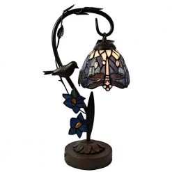Our Broadview Bank accent lamp adds a genteel floral touch to any decor style. The delicate oblong banker shade features pastel pink and red rose blossoms and lush greenery against a light beige background. An intricately detailed blue butterfly, nestled amongst the blossoms adds a whimsical touch. The shade rests atop a metal harp style base, which is cast, with fine floral detailing. Perfect on a dainty writing desk or nightstand, our Broadview Bank accent lamp will bring subtle color and charm to any room in which it is displayed.