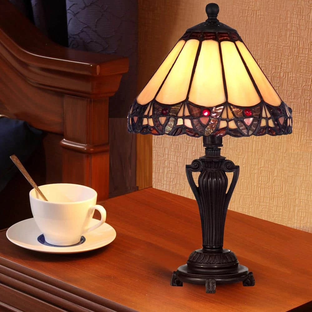 The light amber art glass panels in this accent lamp will provide a warm backdrop for the iridescent peacock feathers running around the bottom edge of the shade. Intricate filigree overlay creates the outline of the feathers, each of which has a glass insert in a different color and are accented on top with a deep crimson art glass jewel. The footed pedestal base is finished in antique bronze, giving this lamp an antique feel that will be perfect for a den, study, family room or office.
