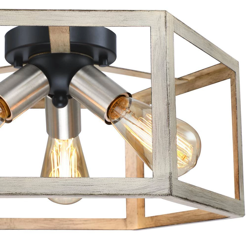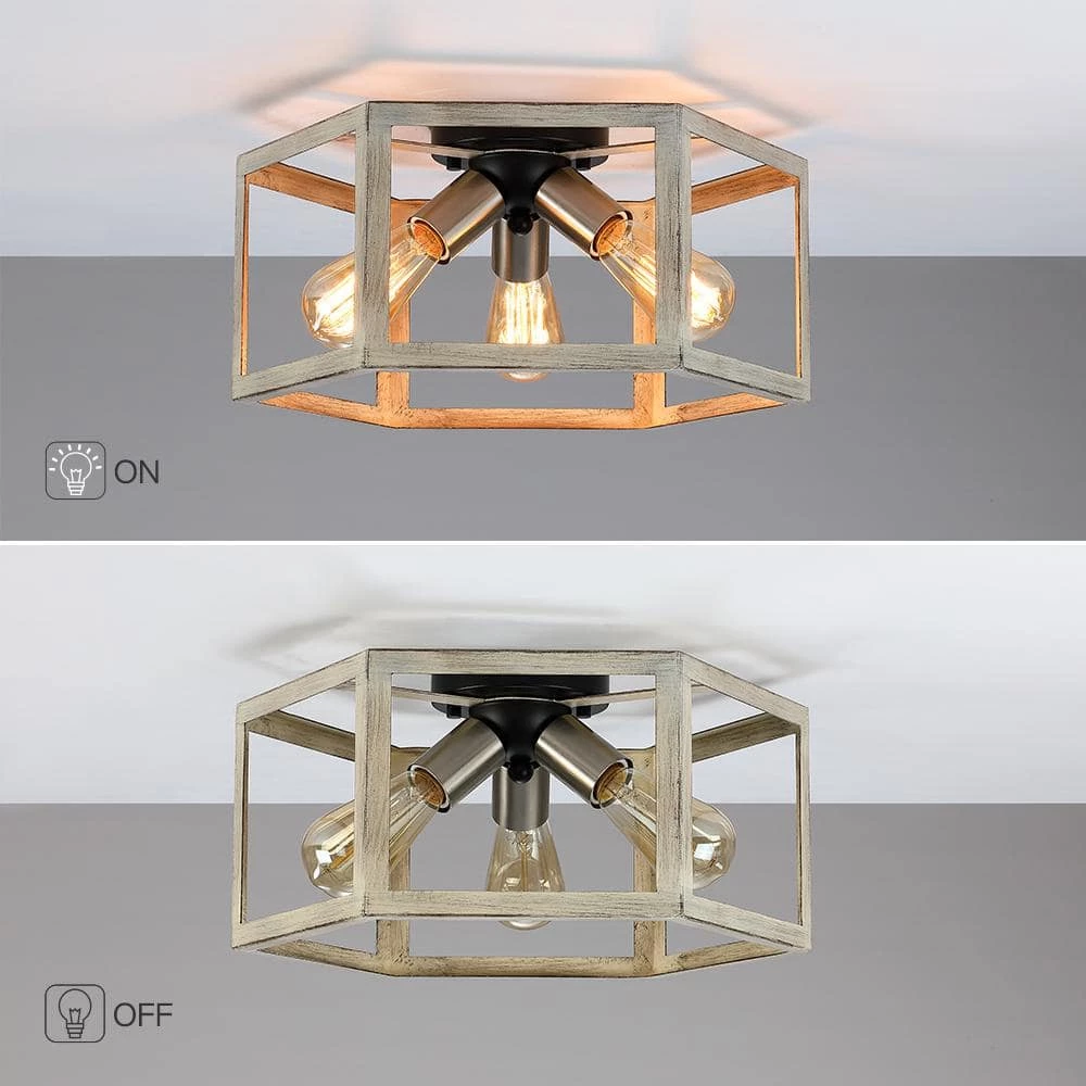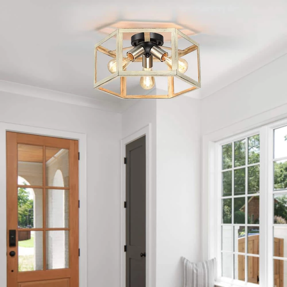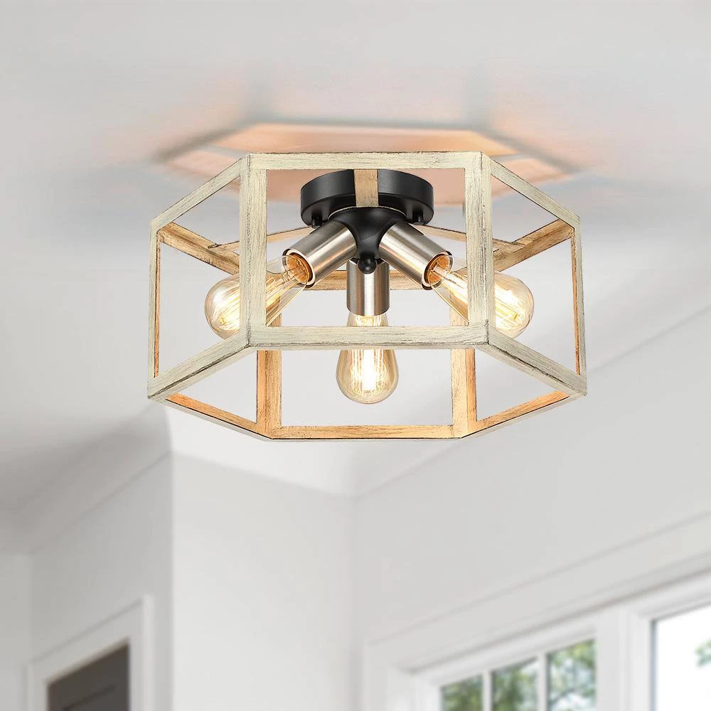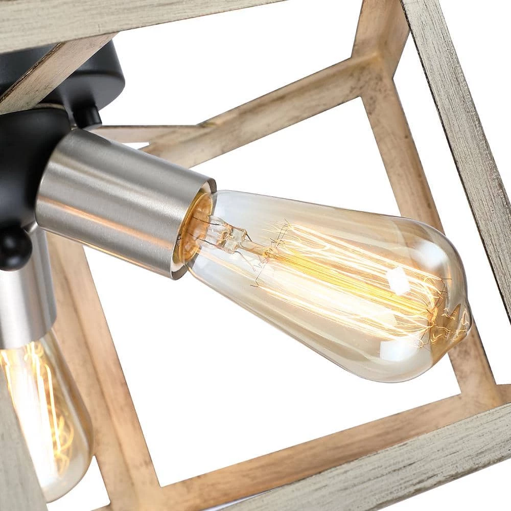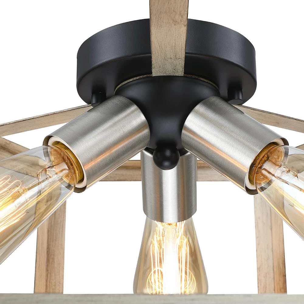 Enhance a living area or bedroom with the modern farmhouse appeal of this modern ceiling light. The geometric open box design features a hex frame in painted wood accent, while the brushed nickel cups add a modern flair which completes the look. Vintage style Edison bulbs (not included) are recommended for this farmhouse-rustic style fixture which is an ideal selection for hallway, entryway, stairway, door way, closet, pantry, kitchen, sitting room or a foyer to bring warmth to a living room or bedroom.