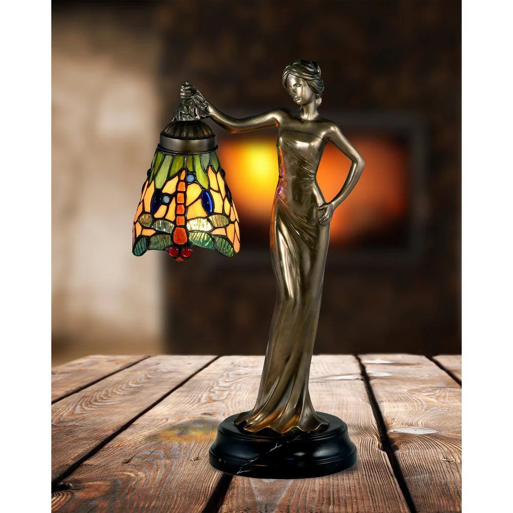 Our Arianna Accent Lamp adds delicate charm and grace to any decor. The beautifully cast base is finished in Antique Bronze and portrays a lovely young female in a flowing gown standing atop a large round pedestal base. A brightly colored tulip shade hangs from her outstretched arm. The shade features an allover design of bright spring blossoms in yellow, green and amber. The flowers are accented with art glass jewels in blue, green and amber to add extra sparkle and color when the lamp is lit. A perfect choice for living rooms, bedrooms, or offices, our Arianna Accent Lamp also makes a very lovely gift for that special someone, including yourself.