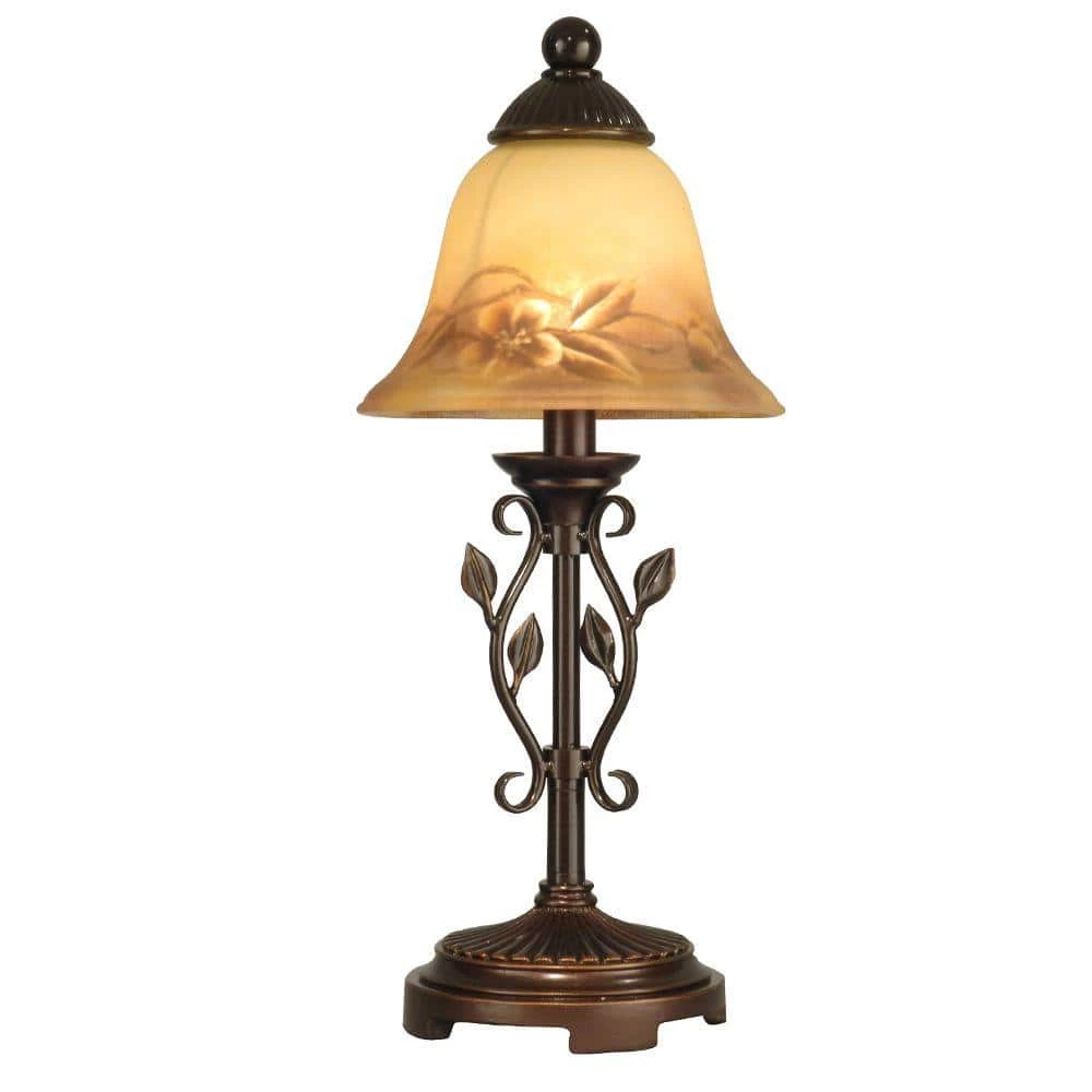 This pleasant accent lamp brings a vintage feel to your home or office. The graceful dome shade is buttery light amber. A leafy vine has been painstakingly hand painted in reverse on the inside of the shade. The exquisite base features a center column surrounded by graceful scrollwork, which has been accented by cut leaf details. The footed pedestal is beautifully textured, which provides an excellent balance to the elegantly simple beauty of the shade. A perfect finishing touch to any room and decor style, this hand painted accent lamp is destined to become a family treasure that will be cherished for many years to come.