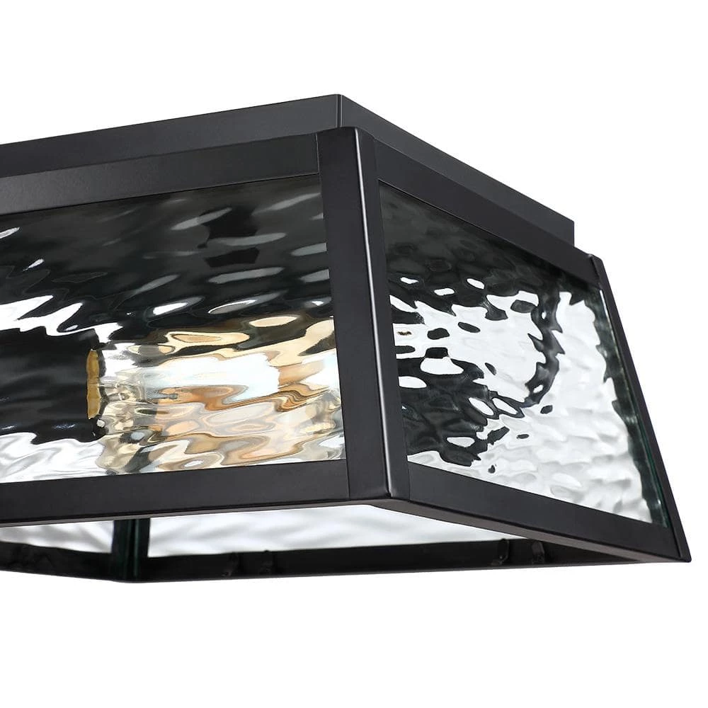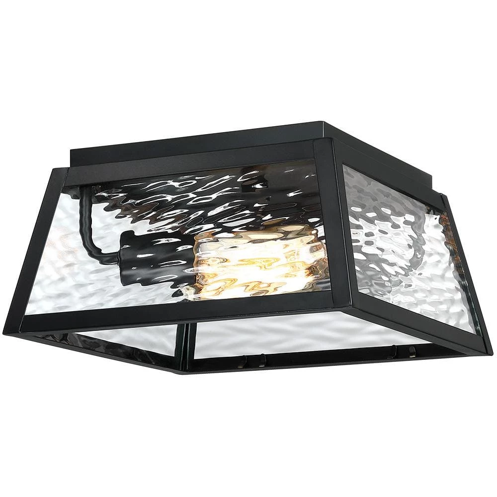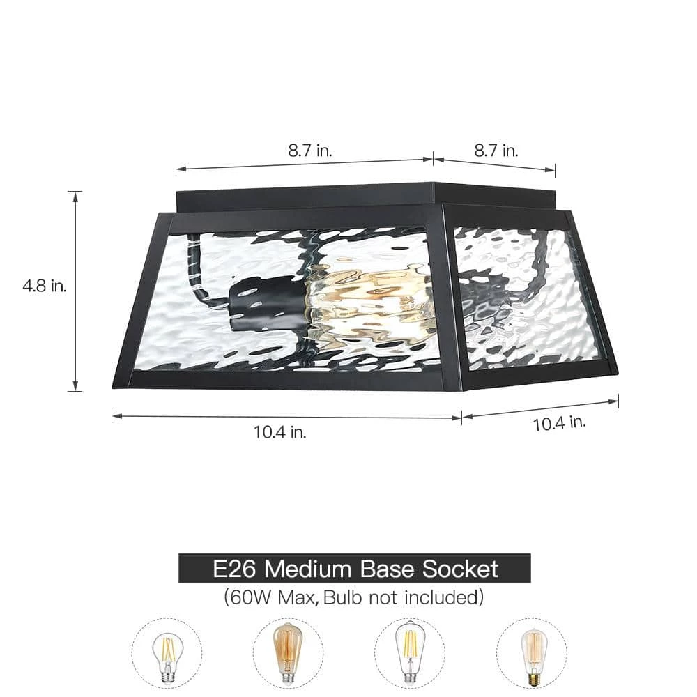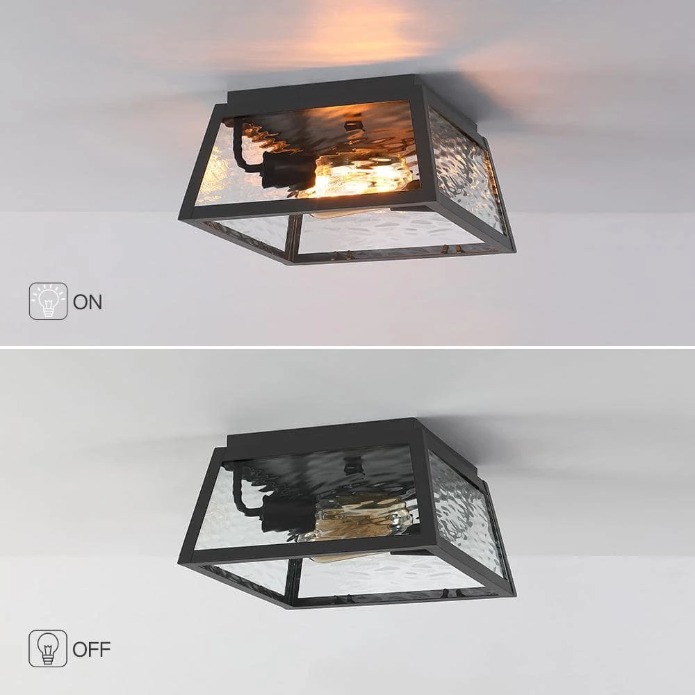 This exterior flush mount brightens up your front door, porch, or bathroom in a contemporary style. It can be installed in covered outdoor areas or bathrooms, or any other indoor areas. It’s made from metal and features a clean-lined rectangular design. The open frame has clear water glass panels that cast an appealing light and lends to its vintage charm. Vintage style Edison bulbs (not included) are recommended for this transitional style fixture.