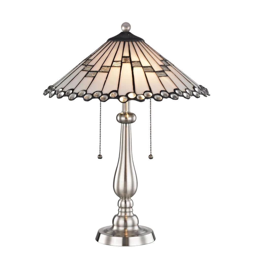 The icy, crisp tones in our Jensen Table Lamp create a look that will easily accentuate any decor style. The cone shade is crafted of thin wedges of art glass in creamy natural that are set in bold filigree. The center circumference features a wave design of frosted glass squares that adds a lovely texture to the gentle glow of the background. The shade’s bottom edge is bordered with pairs of clear art glass gems, set at angles to mimic the pattern in the shade. The metal base features a rounded bottom center column that sits atop a complementary base and pedestal round, all fished in sinuously cool Brushed nickel. A column break just under the shade is finished to match the base to add extra visual interest. A great choice for end tables or nightstands, our Jensen Table Lamp also makes a very one of a kind desk lamp on larger desks or work areas. A great choice for end tables or nightstands, our Jensen Table Lamp also makes a very one of a kind desk lamp on larger desks or work areas.
