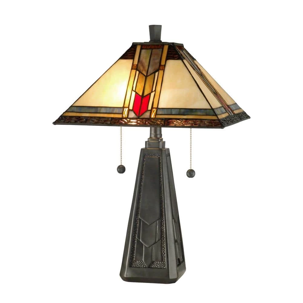 Stately chevrons are the inspiration for the Mallinson table lamp. Light amber art glass provides a perfect backdrop for the chevron pattern in dark amber, tan and deep umber tones. Bands in corresponding hues run along the top and bottom of the square, mission style shade. The chevron pattern continues in the monolithic style tower base, where the chevrons have been tooled directly into the mold. The base is done in a lovely coffee black finish, making this a perfect lamp for a den, study, office or library, 14 in. W x 21 in. H. Shade 14 in. square. 2 x 60 in. W med base.