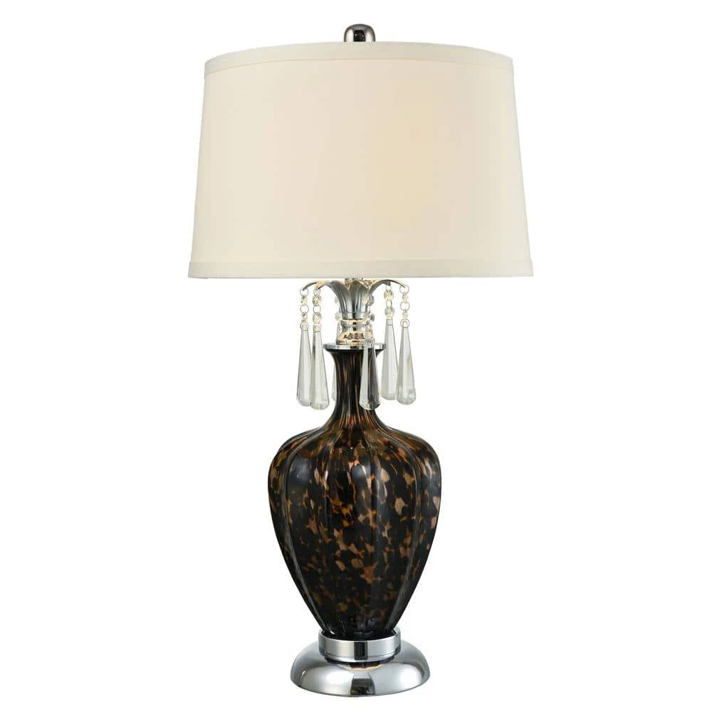 Living up to its name, our Elements Table Lamp is a harmonious blend of textures and design elements that will easily accentuate any decor. The center column is enveloped in a large ginger jar that is crafted of hand blown art glass in a warm tiger’s eye pattern of gold, amber and brown. Elements is topped with a simple drum shade in crisp white fabric that is designed to direct the light from the included dimmable LED Module downward over a series of 6 crystal beaded chains, each with an elongated teardrop. The crystal hangs from a metal vase cap that is cast in a leaf texture and finished in gleaming Polished Chrome to add more sparkle and shine to the crystal when the lamp is lit. Elements sits atop a stepped metal pedestal finished in matching chrome and is topped with a faceted crystal finial. A perfect choice for just about any decor style, our Elements Table Lamp’s collection of texture will quickly become a family favorite.
