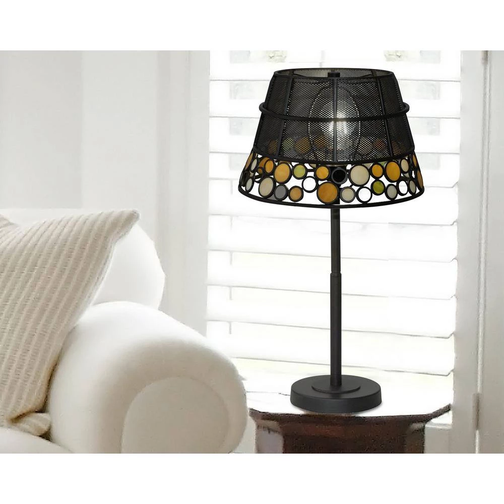 Our Pasqual Mesh Tiffany Table Lamp features a contemporary style that will adapt to your home’s evolving decor. The shade features a metal mesh top, wrapped in a metal frame that is finished in Antique Bronze to give the fixture its industrial feel. A wide bottom border of circular art glass pieces in amber, white and yellow, outlined in matching filigree adds to the contemporary vibe. The modern metal base is finished Antique Bronze to match the mesh in the shade and features a sleek center column and round pedestal. A chic look when displayed in pairs on matching end tables or nightstands, our Pasqual Mesh Tiffany Table Lamp will provide you with many years of stylish and reliable lighting.