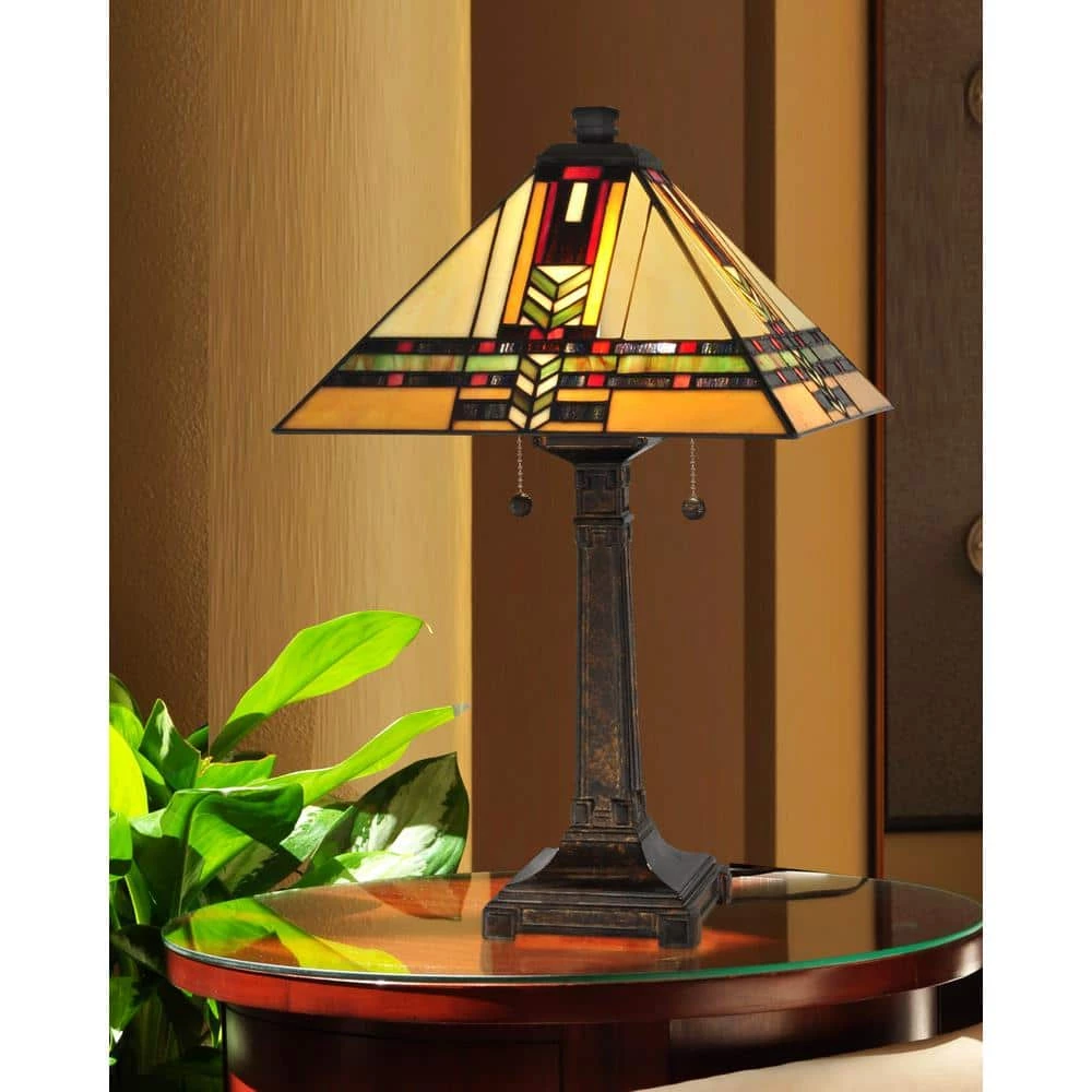 A kaleidoscope of mission-inspired color makes our Palo Mission table lamp a welcome addition to your home or office. The square shade features a base color of light and medium amber art glass panels. A vertical band of arrowheads in green and amber is surrounded by deep red, blue, orange and yellow squares and rectangles. A horizontal row of green and amber swirled glass is bordered top and bottom by rectangular panels in complementary colors. A squared metal base is cast with geometric detailing to complete the authentic mission feel. A bright splash of warm color in any room, our Palo Mission table lamp is one you will be proud to display for many years to come.