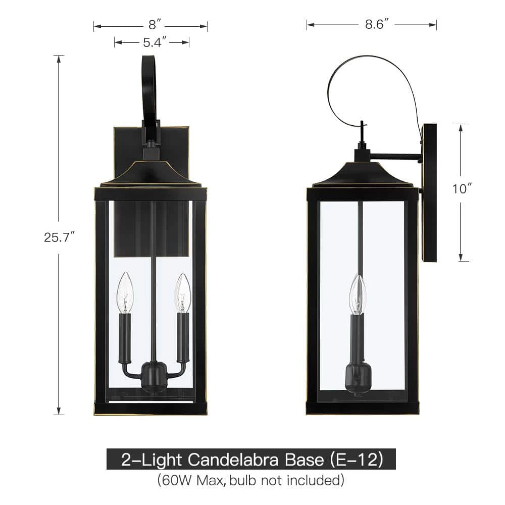 - 8 in. W x 25.7 in. H x 8.6 in. E, backplate: 5.4 in. W x 10 in. H, candelabra base (E-12) 60-Watt X 2 maximum (bulbs not included)