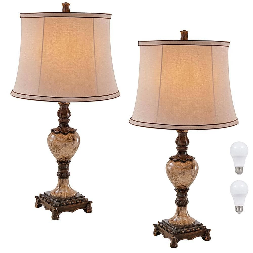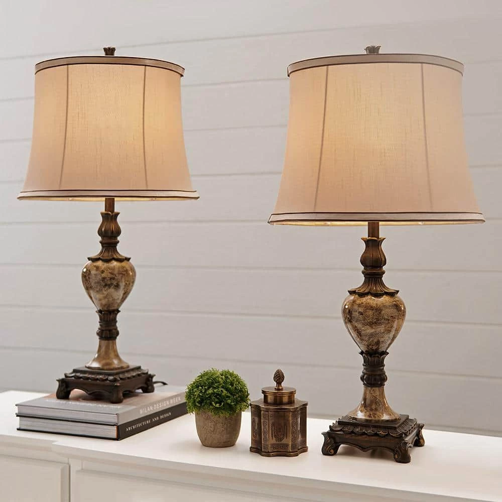 - 2-pack lamp set: 26 in. H overall, faux marble lamp base with round beige shade which is 13.5 in. Dia X 10 in. H
