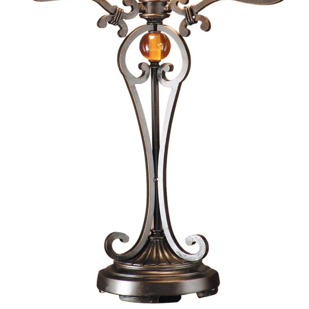 Inspired by French Nouveau glassmaker, Emile Galle, the Boehme series is guaranteed to add a French flair to just about any room in your home. This gracious table lamp features 696 pieces of glass in lovely earth tones that have been etched and double overlaid. The addition of traditional Tiffany style art glass jewels in complementing colors creates a marriage of the two classic styles. A bold, yet graceful iron base in an antique golden sand finish, with an amber glass globe set inside the scrollwork brings the two distinct styles together for one lovely result.