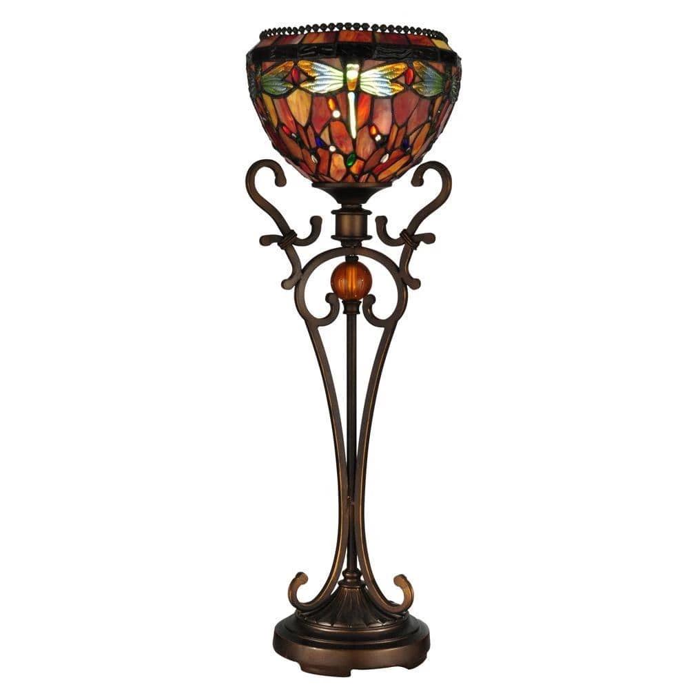 Our Briar Dragonfly series create a marriage of Renaissance era inspired wrought iron and Tiffany’s iconic dragonfly for a match made in Heaven. The dome shaped shades all feature a background of sunny amber art glass, each with band of iridescent dragonflies running around the shade’s circumference. Art glass jewels in saturated jewel tones are interspersed throughout for added color and texture. Each shade is finished with bead detailing around the edge for added authenticity. This uplit table lamp features a delicate uplit shade sitting atop 3 fluid wrought iron scrolls. The center column is topped with an amber glass orb and is surrounded by more gracefully scrolled wrought iron, which flows down to the pedestal base. Lovely when used as an occasional lamp, our Briar Dragonfly uplit table lamp is simply spectacular displayed in pairs, giving any room in your home an instant decorator’s touch.