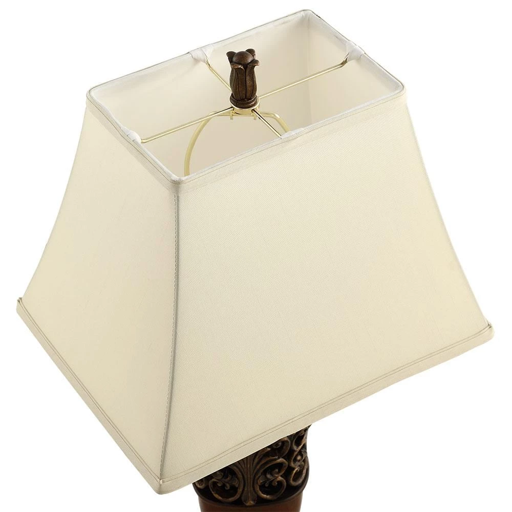 - Shade:rectangular ivory softback shade, each size is:9 in. x 6 in. top, 14 in. x 11 in. bottom and 11 in. on the slant the shades are elongated so they snug up against the wall conserving space on your nightstand for pictures or whatever