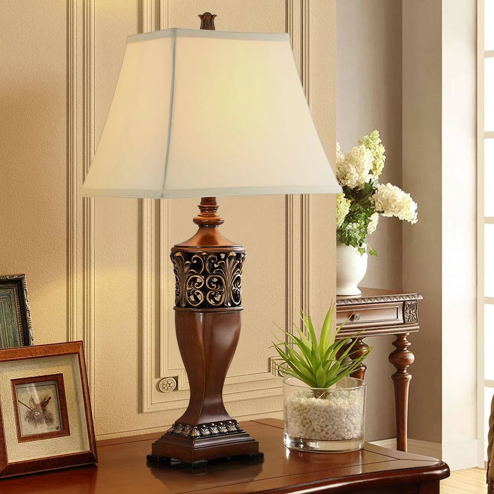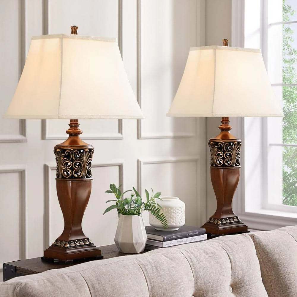 30 in. H makes these table lamps tall enough for useful reading lamps at either bedside or sofa. The shades are enlongated so they snug up againt the wall convering space on your nightstand for pictures or whatever and really bring a touch of elegance to your rustic decor. The lamp base color is 2 tone and the quality is superior. They complement any decor from contemporary to classic.