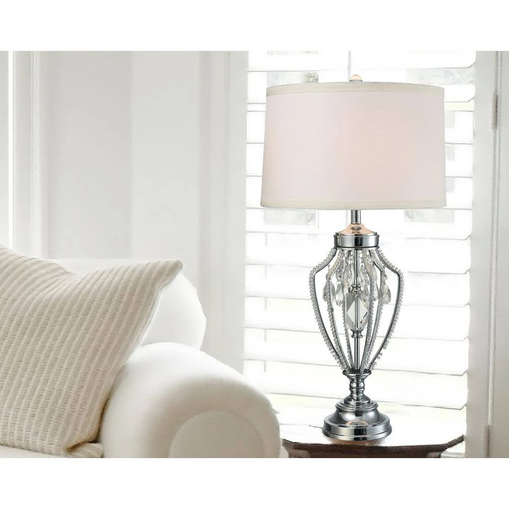 Both functional and beautiful, our Tonya Crystal Table Lamp is a harmonious blend of textures that you will be proud to display in your home. The generously sized lamp features a metal center column with a decorative piece of multifaceted crystal at its center. A bi-level grouping of crystal-beaded chain surrounds the center column. Just beyond, each arm of the open framework urn is outlined with a row of faceted crystal beads. The graduated metal pedestal, center column and framework are all finished in glistening Polished Chrome. We paired Tonya with a drum shade in white fabric, which will direct the light from the included dimmable LED module downward over the crystal and chrome, creating a shower of sparkles throughout the room when the lamp is illuminated. Our Tonya Crystal Table is a wonderful choice for formal living rooms or bedrooms.