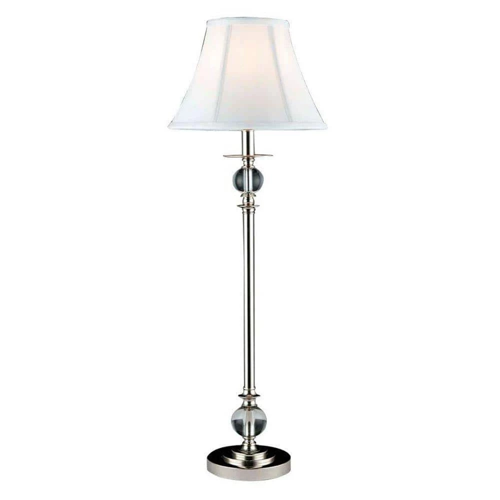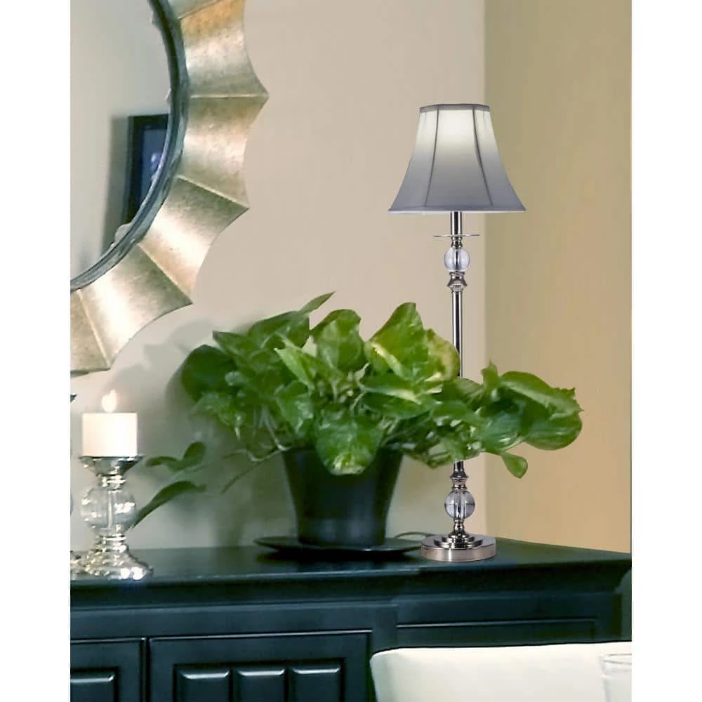 Your good taste will shine when you choose this elegant buffet lamp. Sleek and stylish, the clean lines will accentuate any decor style. Two round clear crystal balls decorate the polished chrome base column. Our designers have chosen a fresh white fabric shade to enhance the simple beauty of the design. A round metal pedestal base, finished in polished chrome provides the necessary stability to support the 32″ height. Lovely alone or in pairs, this lamp will become a treasured family heirloom for many generations.