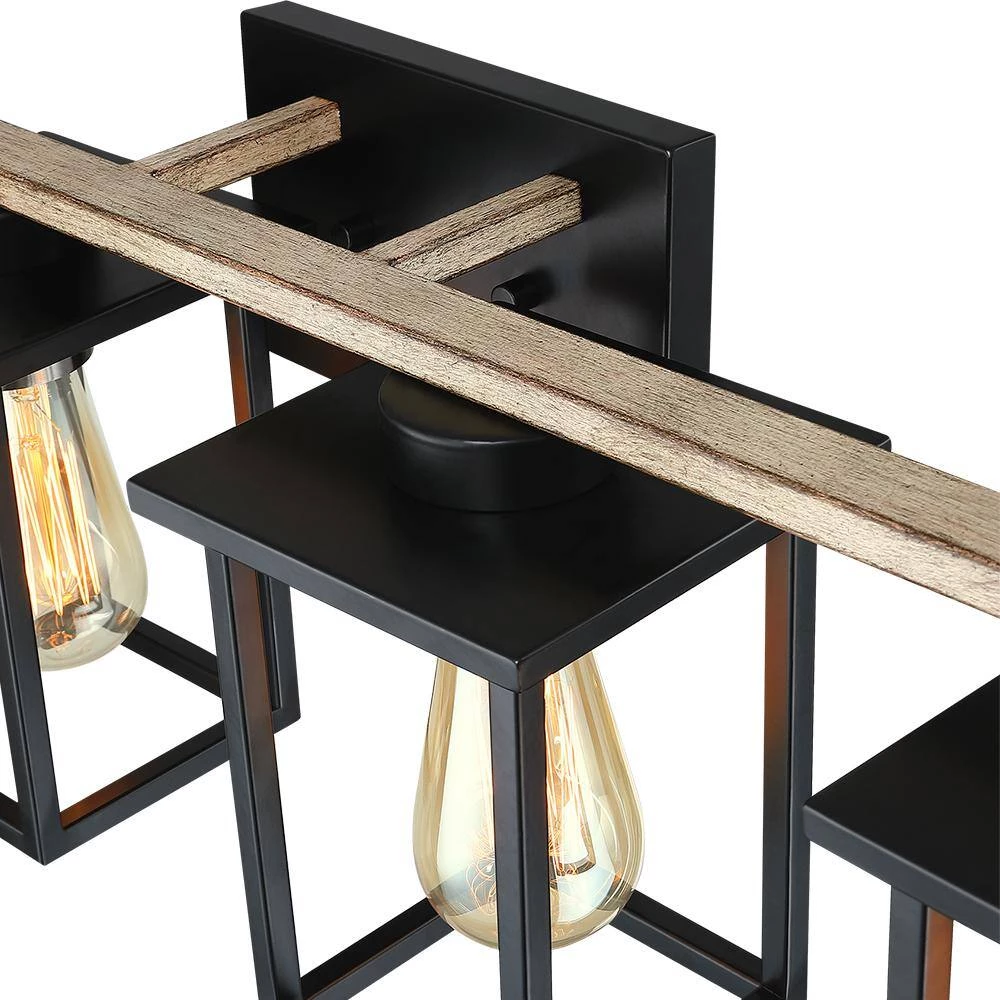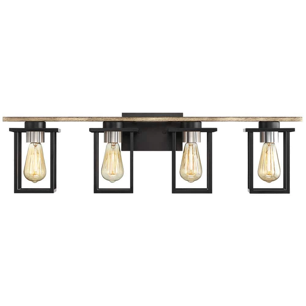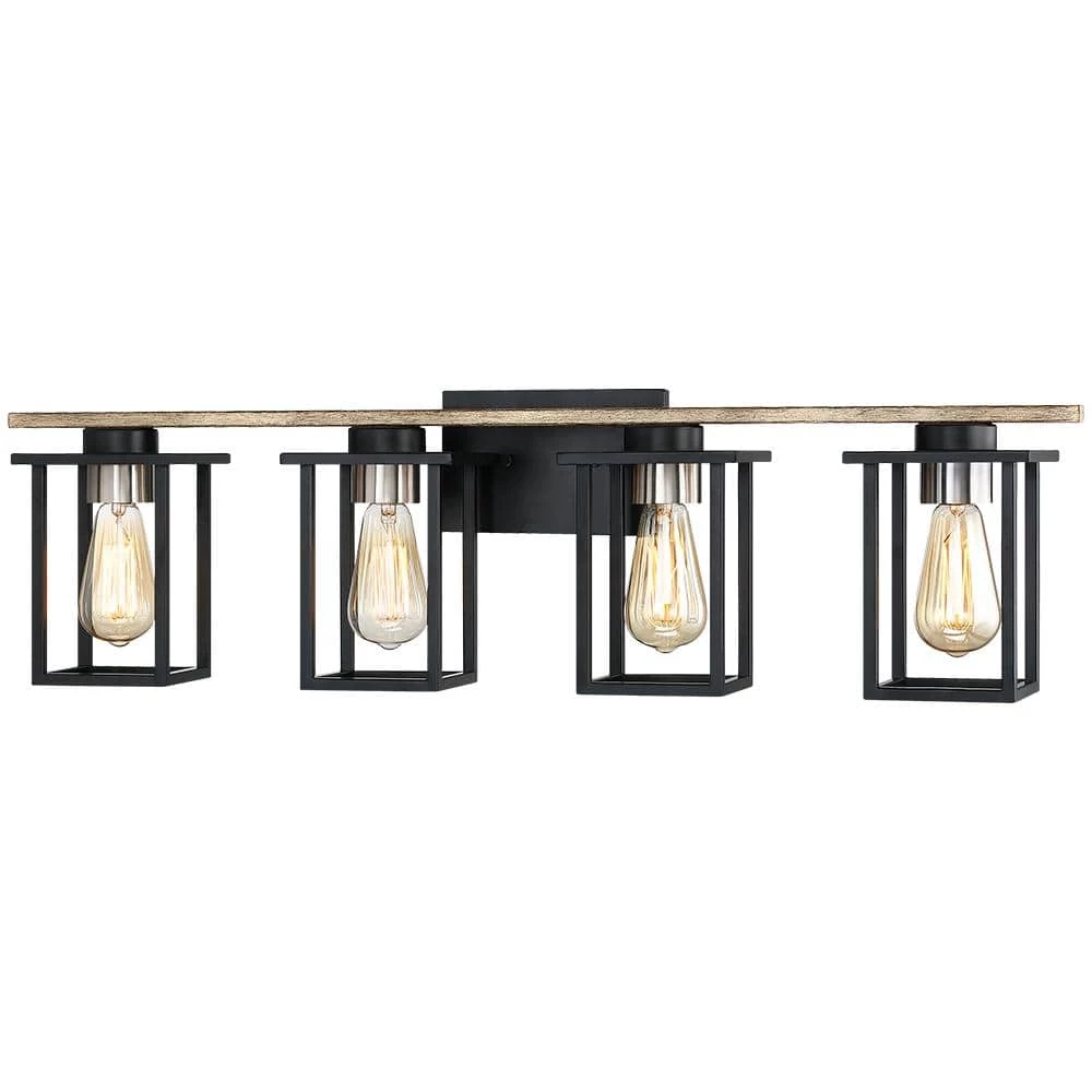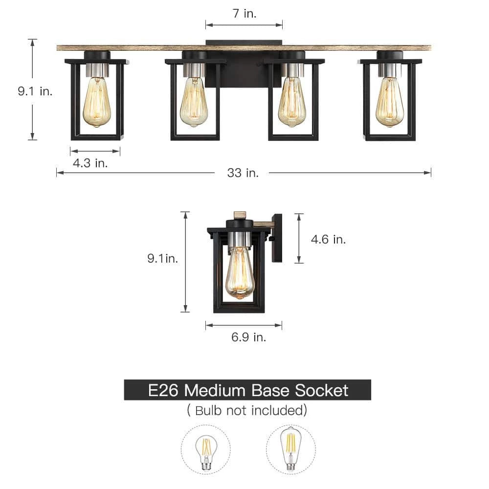 The transitional black 4-light bathroom vanity light fixture by TRUE FINE is inspired from the modern farmhouse trend that beautifully blends rustic, industrial and traditional elements. The rectangular backplate in matte black are tied together with a distressed wood finish bar, while the statement open cage metal shades with brushed nickel bulb sockets adds modern flair. In addition, No glass shades to dust. Vintage style Edison bulbs (not included) are recommended for this farmhouse-industrial style light fixture which is an ideal selection for vanity, powder room, bathroom etc.