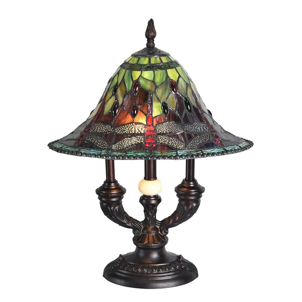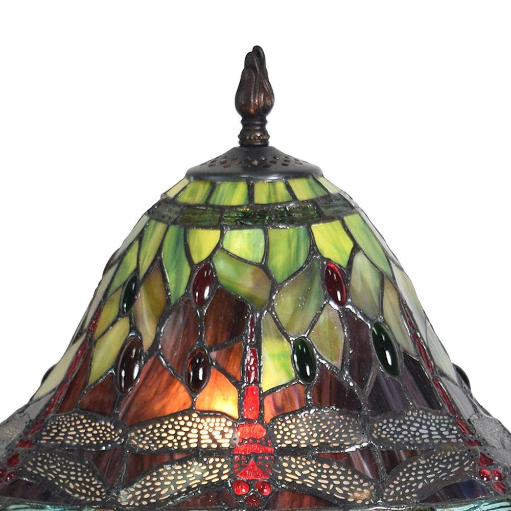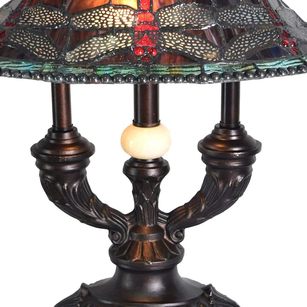 This Albany Dragonfly Tiffany Table Lamp has a retro feel that will be at home in any decor. The lamp features a flared bell shade with a deep amber background. The top of the shade features a cascading pattern of leaves in amber and green tones. We added art glass gems in complementary colors for added sparkle and color. A row of Tiffany’s famous dragonflies, each with fiery red bodies and eyes and delicate filigree wings are placed end to end around the shade’s bottom. Each glass piece is hand rolled and individually copper foiled, which may result in slight variations in color. The metal base, finished in deep Fieldstone, features a finely cast allover pattern, split center column with a marble column break in the center. Our Albany Dragonfly Tiffany Table Lamp is perfect in dens, offices, or bedrooms. NOTE: Due to the nature of handmade art glass, colors, sizes and patterns may vary slightly.