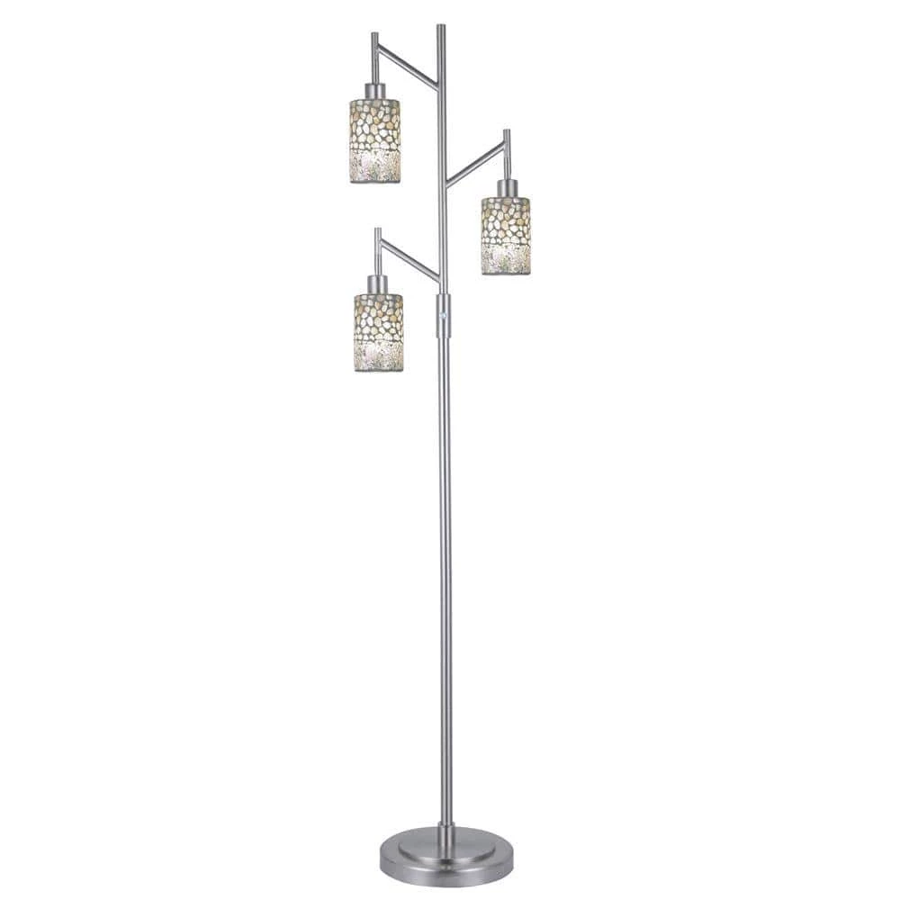 The cool, crisp lines of our Alps series, from our Contempo Collection feature a combination of innovative style and time honored craftsmanship that you will be proud to display in any room in your home. This modern 3 light floor lamp features a trio of cylindrical shades. Each shade is handcrafted in mosaic art glass in delicate earth tones. The top of each cylinder consists of glass pebble stones, which our designers have paired with smaller glass pieces, set in an intricate mosaic pattern around the shade’s bottom edge. Each of the 3 lights swivel, allowing you to direct the light as needed. A sleek metal pedestal base and post adds to the ultra modern feel of this fixture, which will complement any design style in your home.