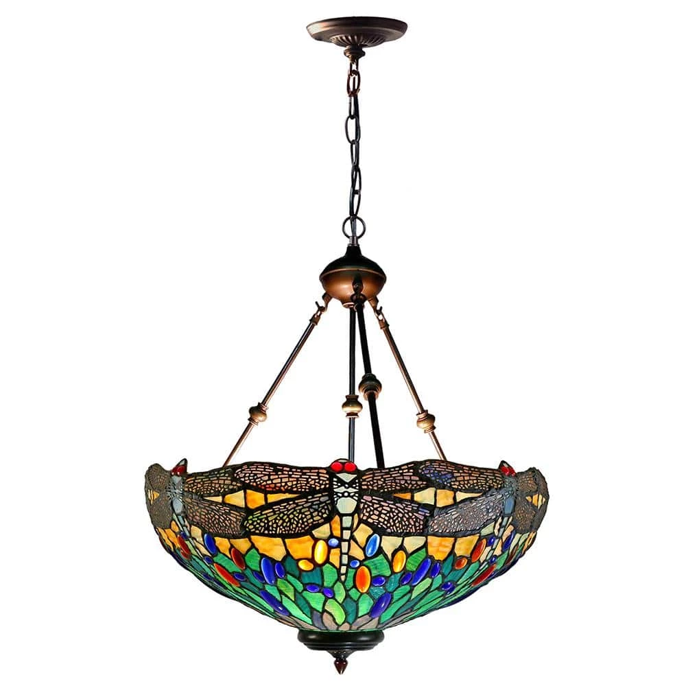 Our magnificent Anacapa Dragonfly Inverted Tiffany Hanging Fixture is the perfect crowning touch for any room’s decor. The grand fixture features a generously sized inverted bowl shade crafted of art glass. The lower portion of the shade features a leafy canopy of leaves in verdant green tones that give way to sunny amber. Set against the bright amber backdrop, a large horizontal band of Tiffany’s iconic dragonflies are set wingtip to wingtip. Each features grey-blue bodies, art glass gem eyes in bright red, and wings are red with meticulously detailed filigree. We added a considerable number of art glass gems and jewels in complementary colors for added color, texture and sparkle when the fixture is illuminated. Anacapa hangs from a round metal ceiling canopy and wire chain/cable that are finished in rich Dark Brown. Just below, a metal fount and 4 side support tubes, each with decorative column breaks are finished to match in Dark Brown. A stunning fixture over a large dining area, our Anacapa Dragonfly Inverted Tiffany Hanging Fixture also makes a dramatic statement in grand foyers or stairwells with soaring ceilings. NOTE: Due to the nature of handmade art glass, colors, sizes and patterns may vary slightly.