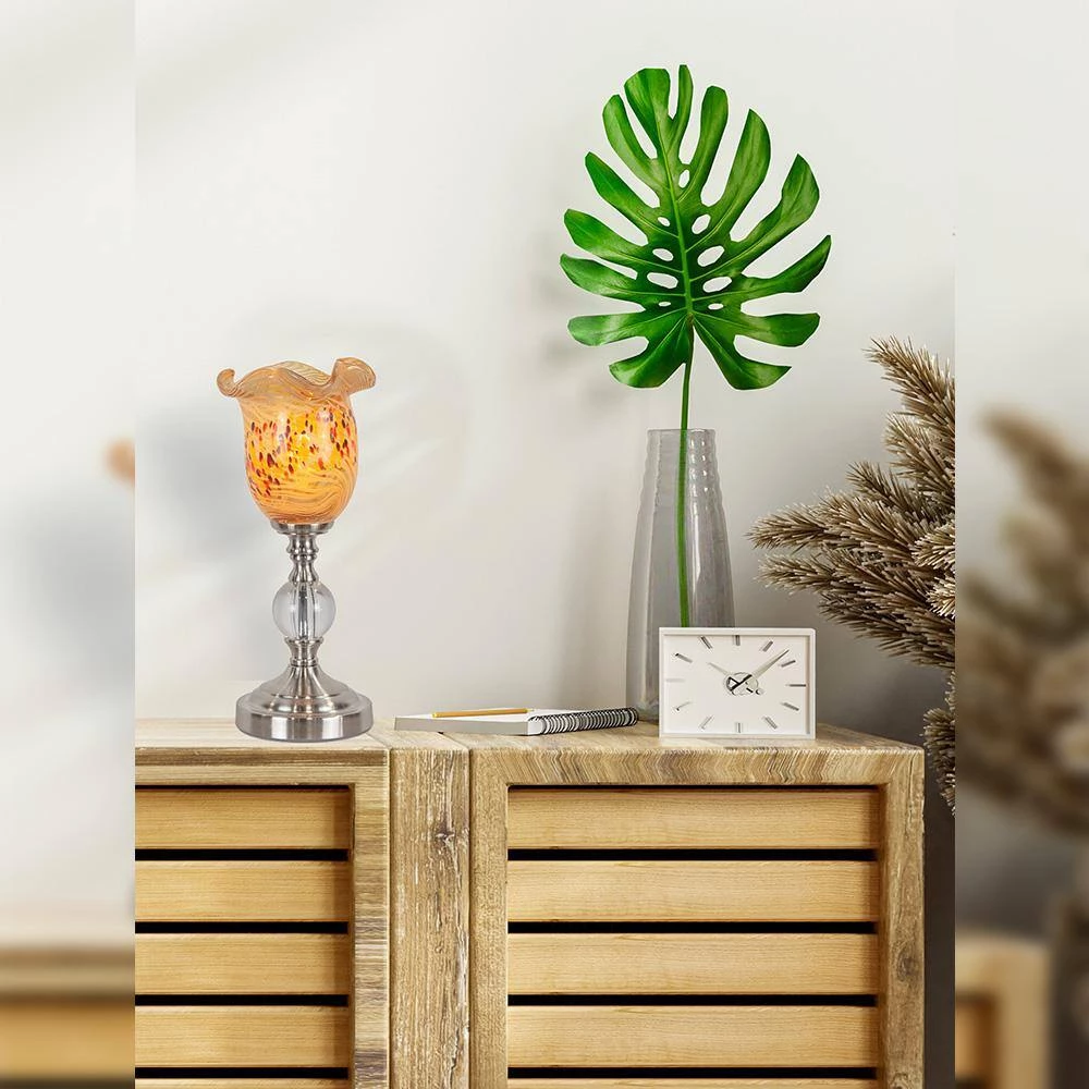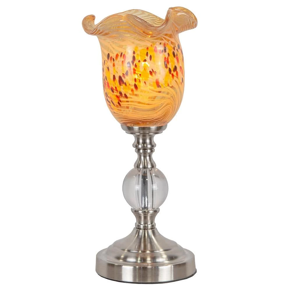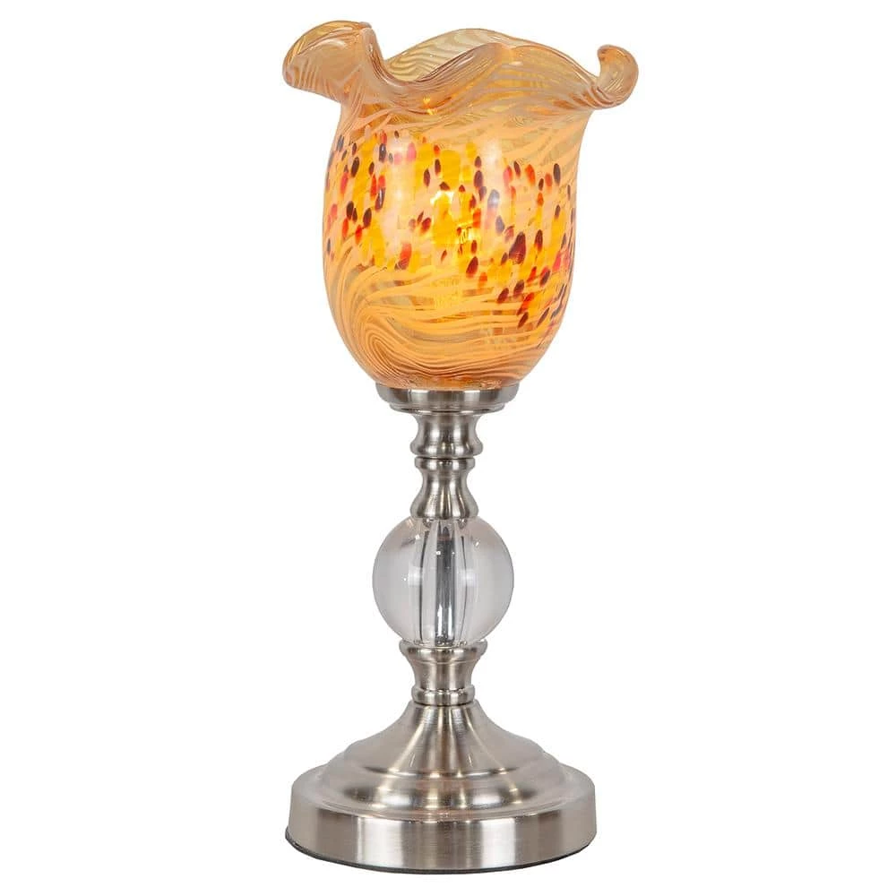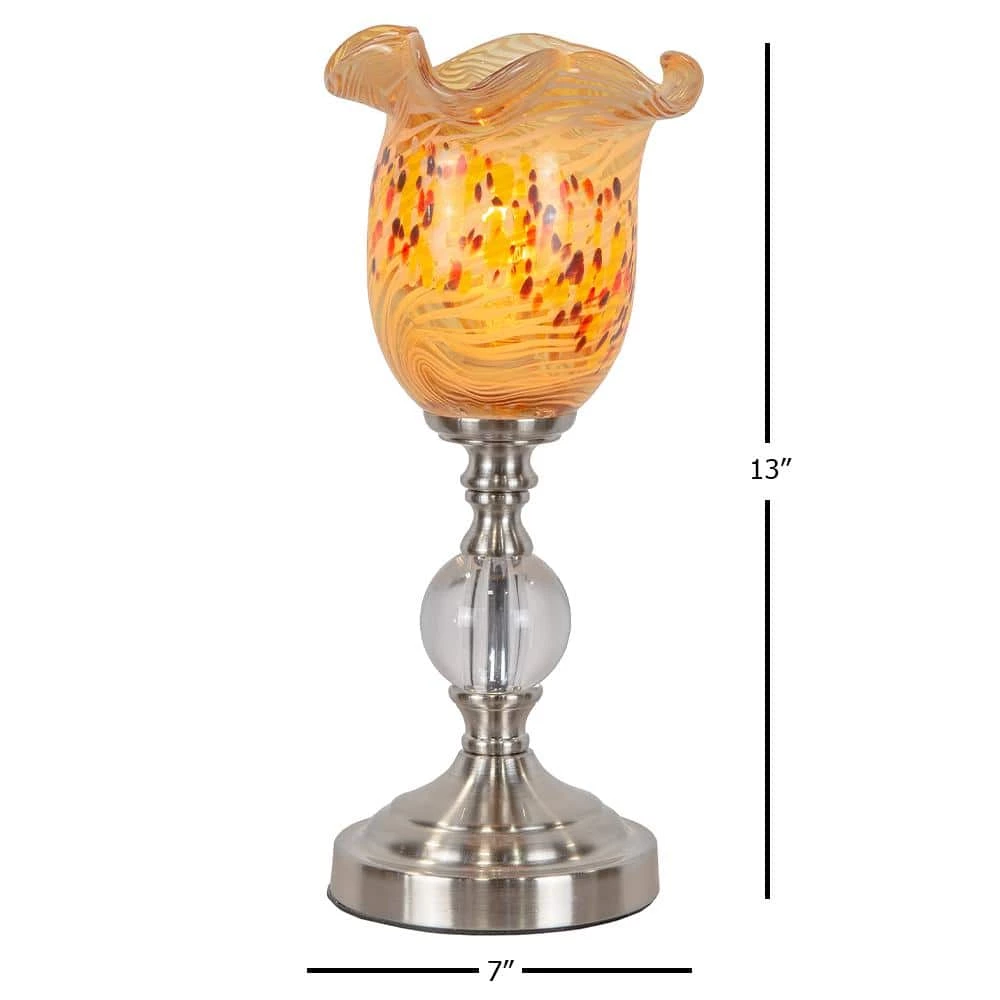 Our Beige Speckled Hand-Blown Art Glass Uplight Accent Lamp is a pretty combination of art glass and crystal that will easily enhance any decor in your home or office. This warm accent lamp features a ruffled uplit shade in bright amber tones that is hand blown using Favrile art glass. First developed by L.C. Tiffany in the late Nineteenth Century, the Favrile process embeds the color within the glass itself which allows for subtle variations in tone and texture. This means that no 2-pieces are exactly alike. The metal base, finished in Brushed Nickel, features a stepped round pedestal and matching vase cap. In between, a crystal orb column break adds extra-sparkle and shine when the lamp is illuminated. A lovely pop of cozy color on bookcases, mantles or curio shelves, try displaying our Beige Speckled Hand-Blown Art Glass Uplight Accent Lamp in pairs on end tables or nightstands for an easy decorator’s touch. NOTE: Due to the nature of handmade art glass, colors, sizes and patterns may vary slightly.