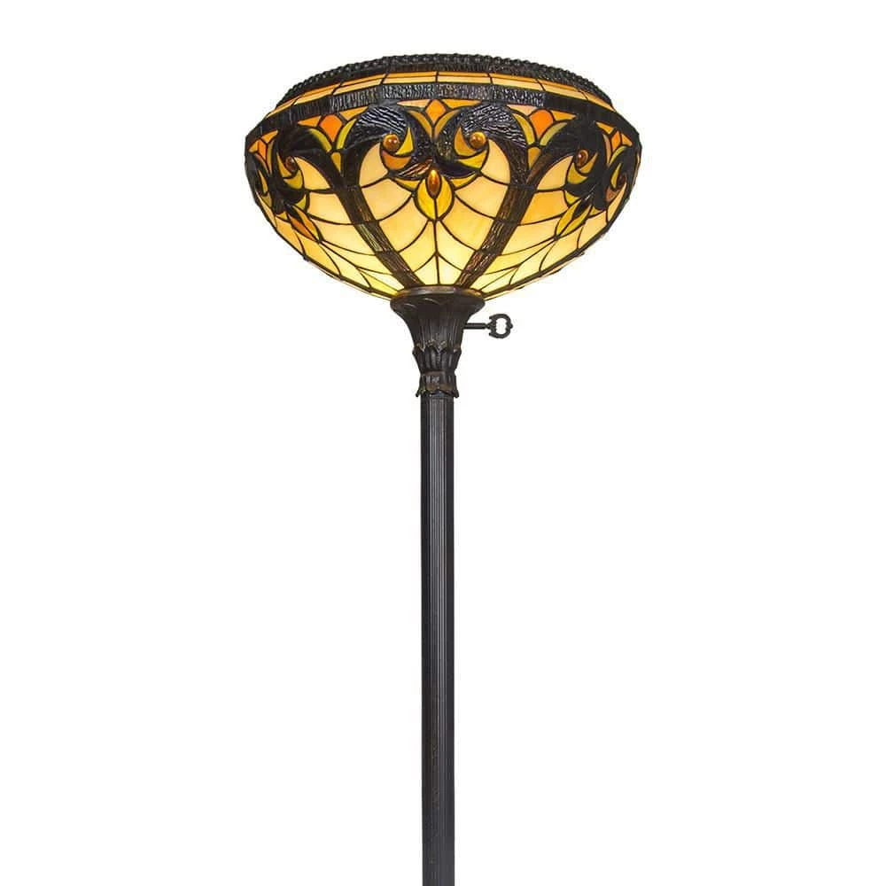 Inspired by French Art Nouveau artist Emile Galle, this impressive torchiere, Biolla from our Boehme family will add a touch of 19th century French artistry to your home. The shade is double overlaid and etched in yellow, orange, and beige tones set in a classic French fleur de lis pattern with a textured border and art glass jewel accents throughout. The uplit shade sits atop of poly iron base. This torchiere’s commanding presence will grace any home or office for many generations to come.
