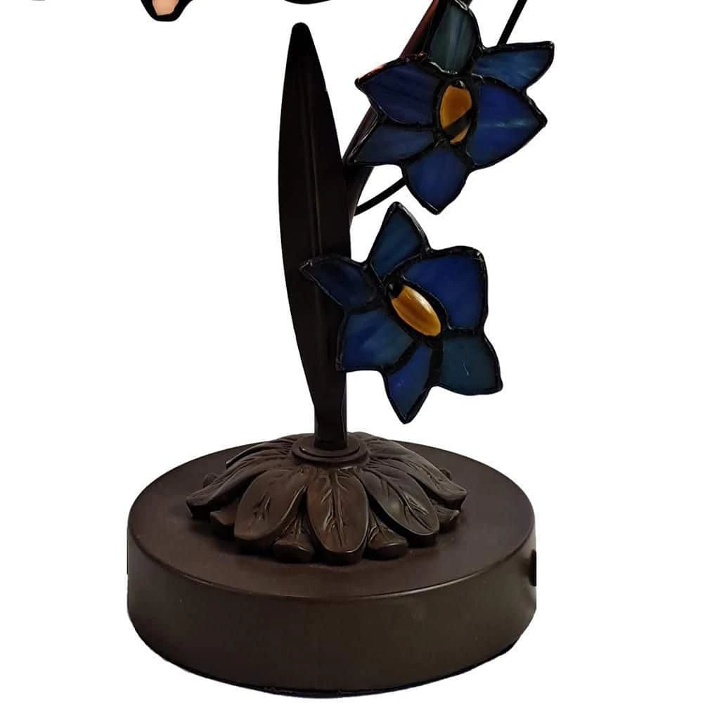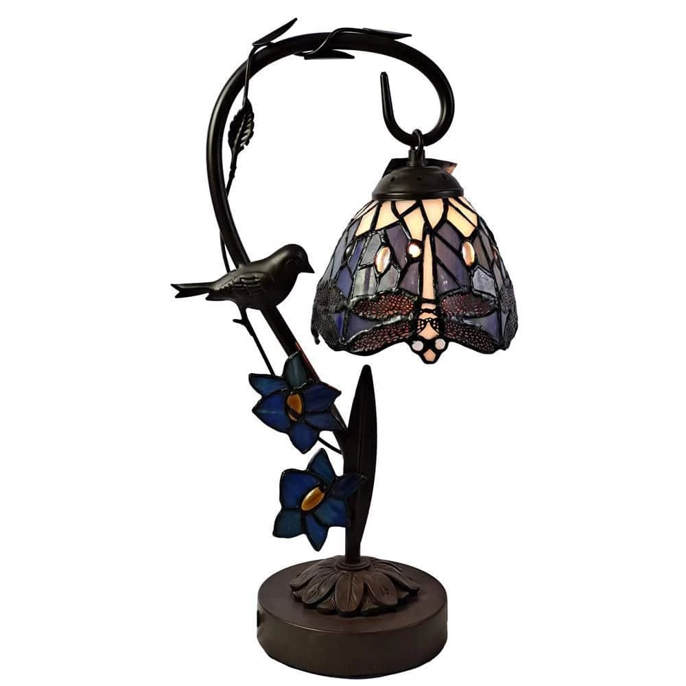This beautiful Bird on Vine Dragonfly Tiffany Accent Lamp adds a colorful touch of springtime to any room and USB charging port designed to provide modern convenience with timeless beauty. The pretty fixture features a finely cast metal / resin stepped pedestal base that is finished in Antique Tiffany Bronze. The center column is a gracefully arched tree branch, complete with 3-dimensional blue flowers and die cut leaves dotted with art glass gems at their centers. A delightful little bird is perched just above the flowers, which adds a whimsical touch. Hanging from the branch’s top end, a dome shade crafted in a beautiful dragonfly pattern in blue adds a bright splash of color when the lamp is lit. An easy way to add a bright pop of color on a bookcase, mantle, or curio shelf, our Vine Dragonfly Tiffany Accent Lamp also makes a wonderful gift for any occasion or recipient.