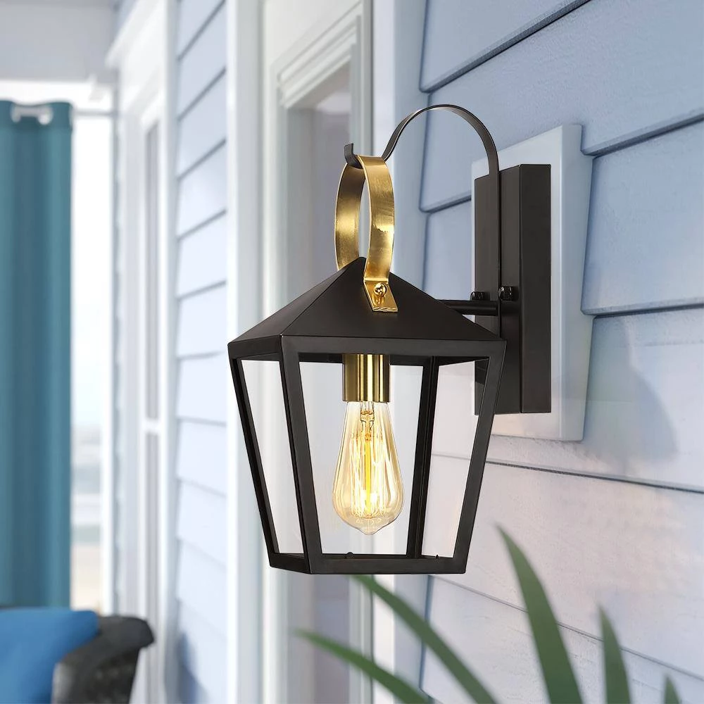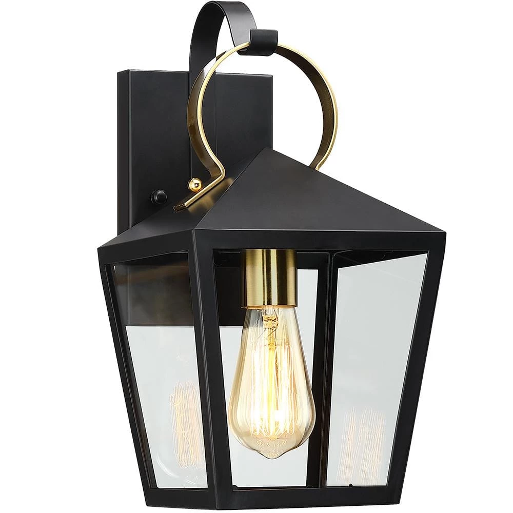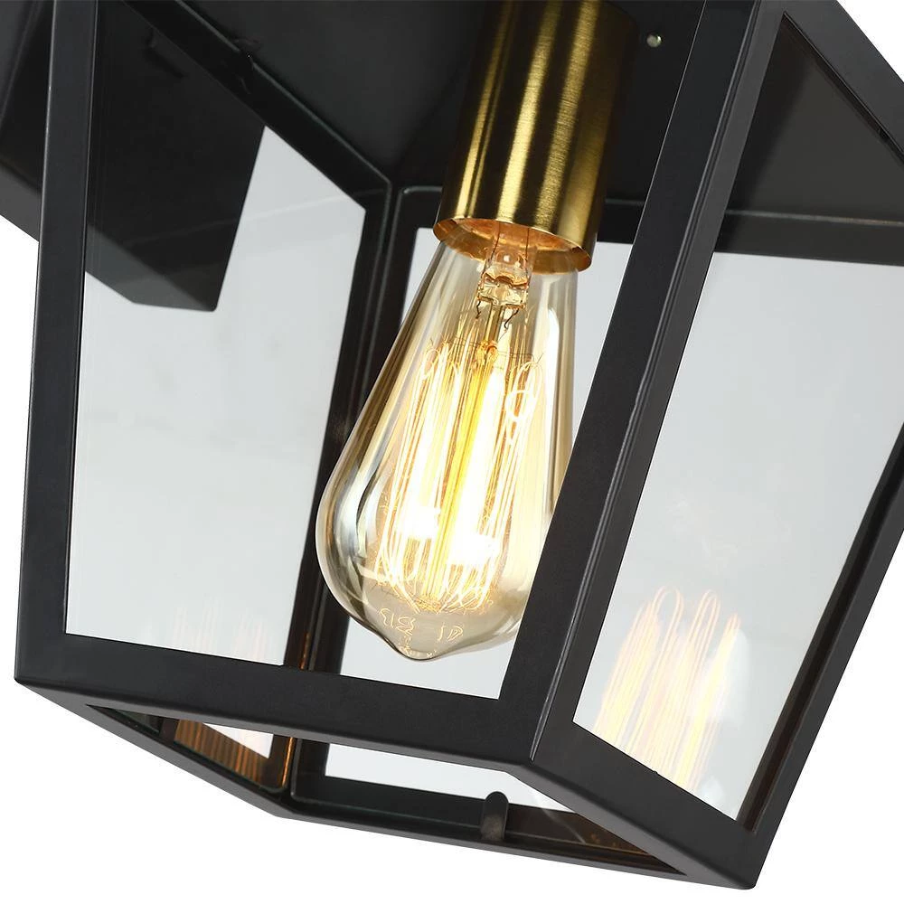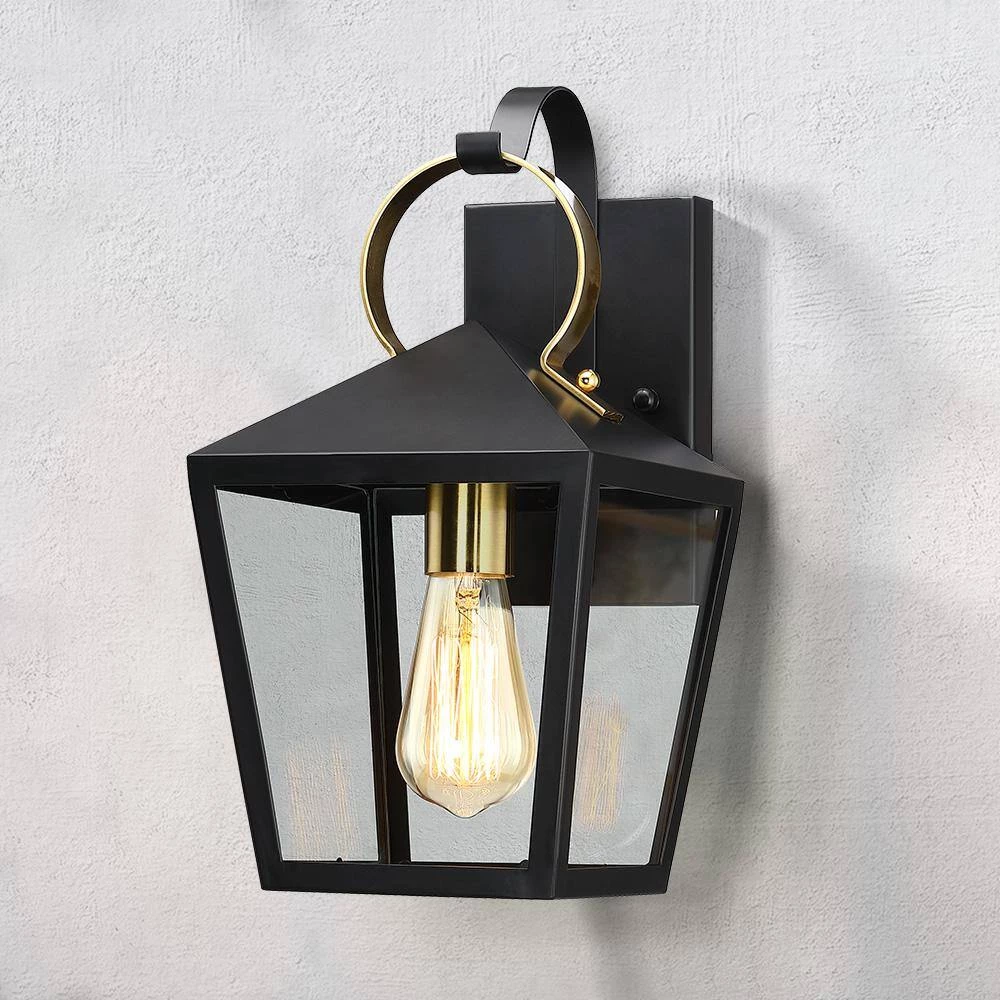 This modern exterior lantern lighting fixture features a brass-finished handle and cup and a lantern style powder-coated black pyramid top body as it rests upon a straight arm connected to a rectangular backplate. Pairing the traditional outdoor wall light with a vintage bulb(not included) is recommended to fully illuminate the glass which spreads a warm and inviting glow. Ideal for Front Porch, Patio, Garage, Deck, Balcony etc.