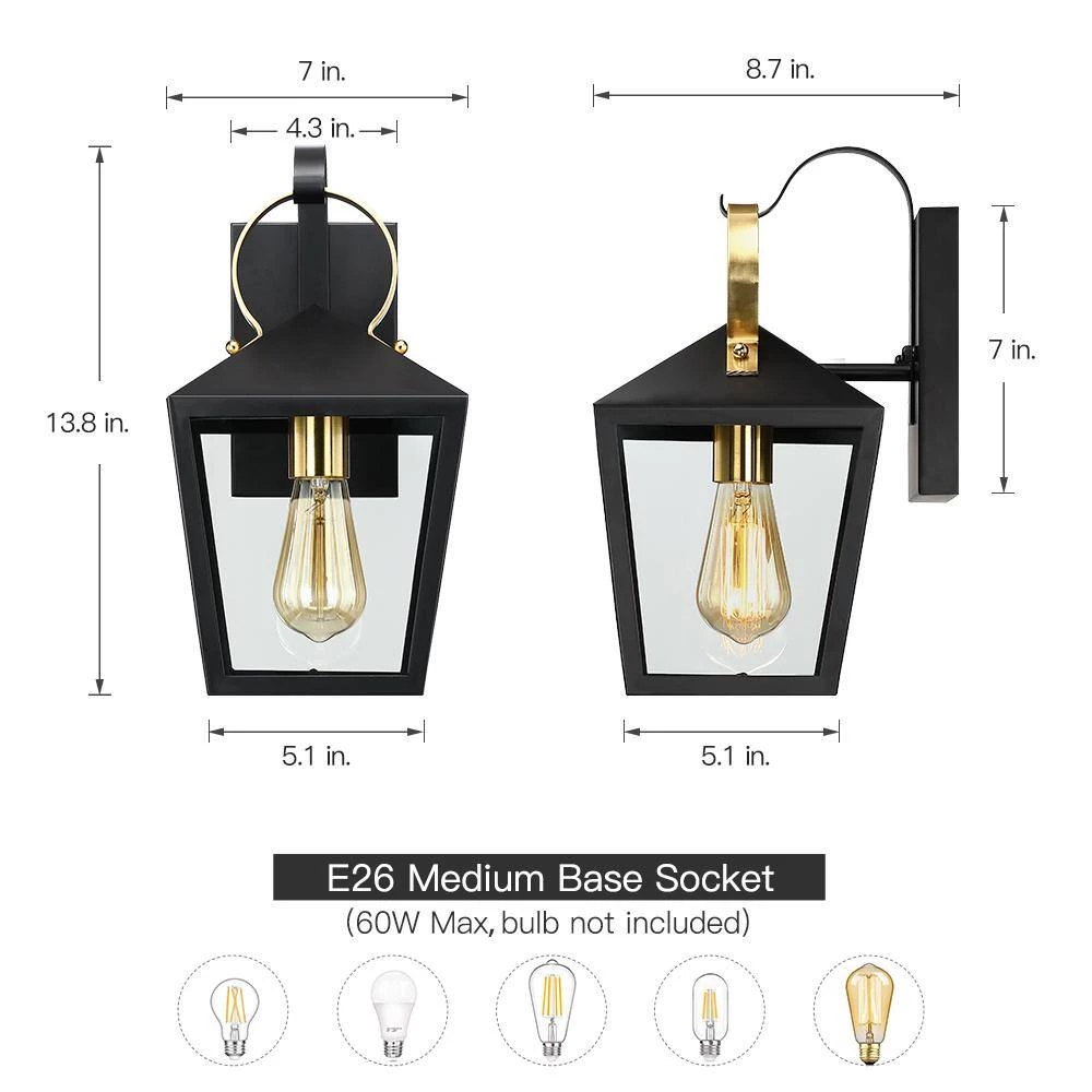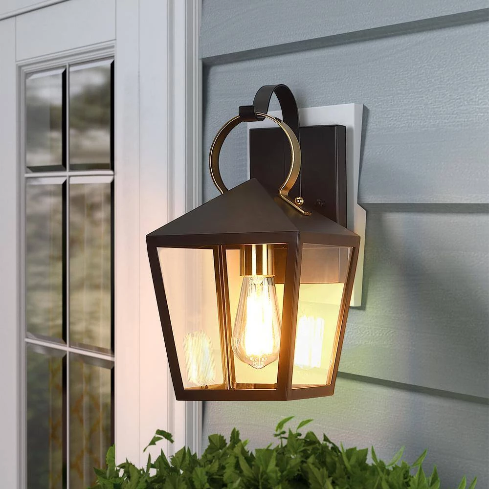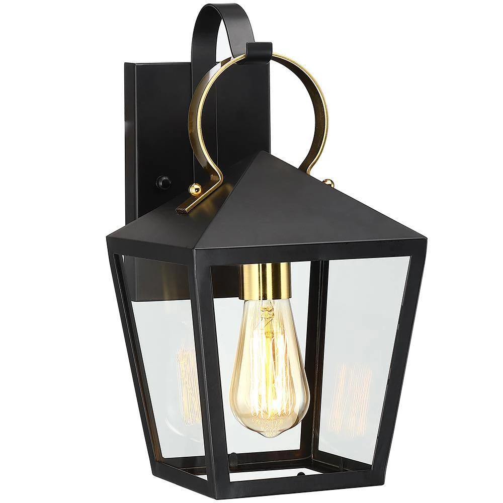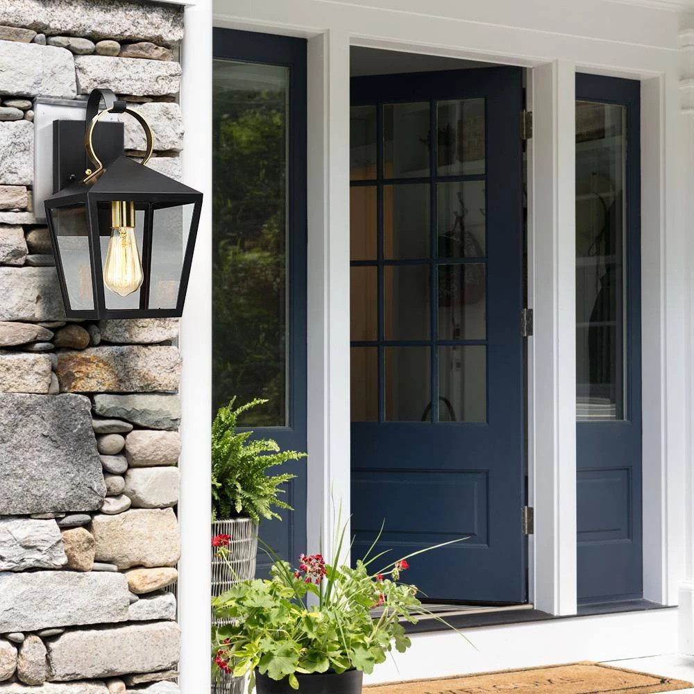 This modern exterior lantern lighting fixture features a brass-finished handle and cup and a lantern style powder-coated black pyramid top body as it rests upon a straight arm connected to a rectangular backplate. Pairing the traditional outdoor wall light with a vintage bulb(not included) is recommended to fully illuminate the glass which spreads a warm and inviting glow. Ideal for Front Porch, Patio, Garage, Deck, Balcony etc.