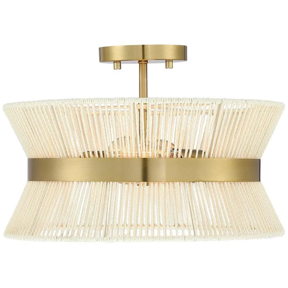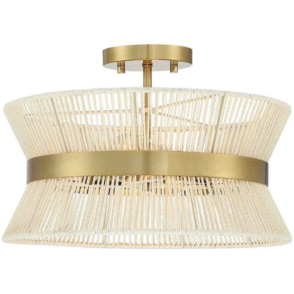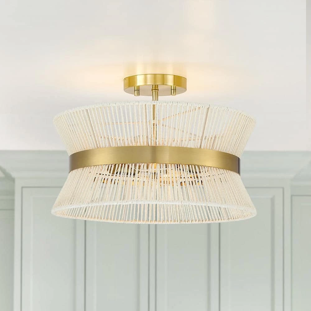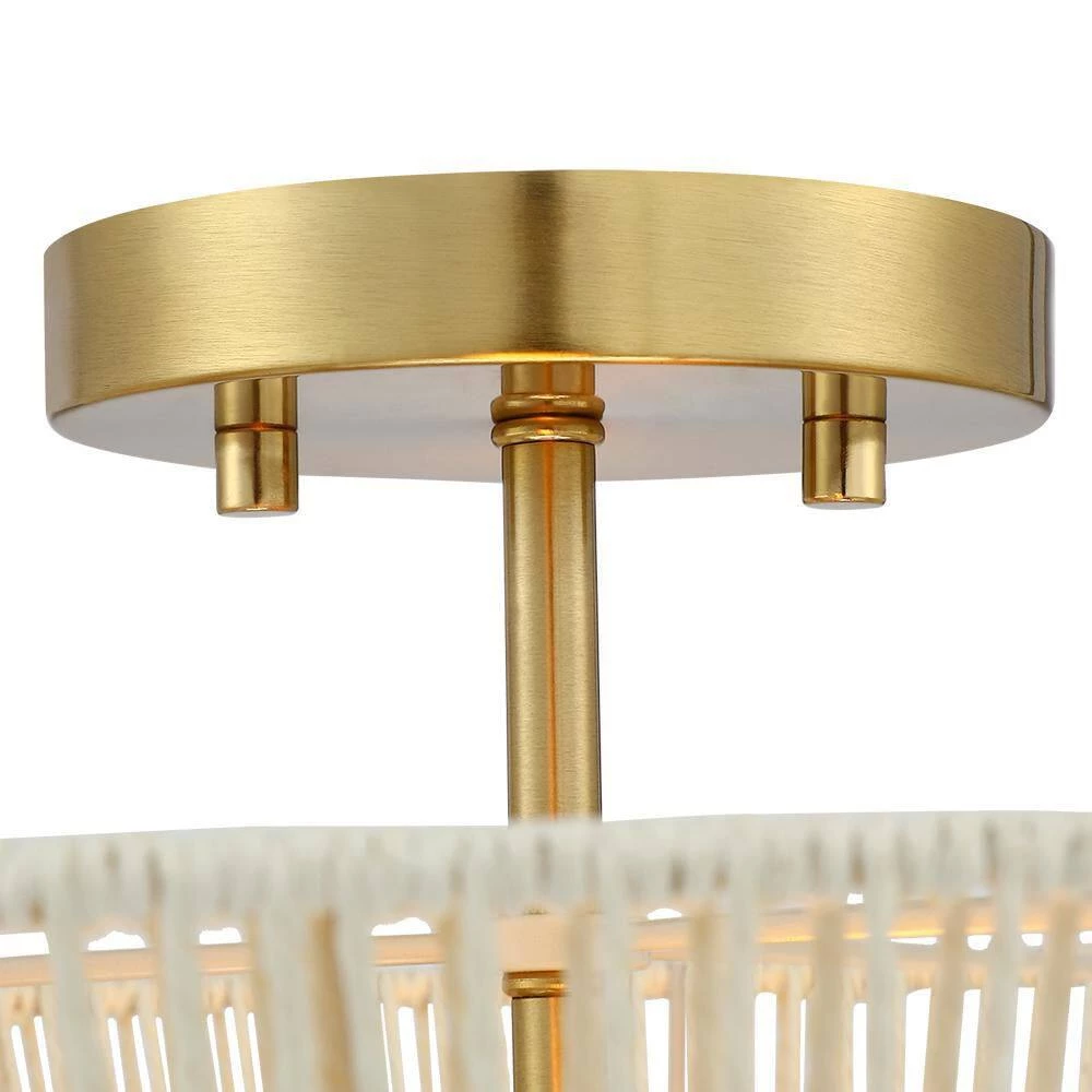 Organic caged semi flush mount ceiling light, crafted of natural rattan/wicker and Brass/gold hardware, is the unique blend of coastal, eclectic, nautical and modern styles. Filtering the light from within, each piece creates a play of light and shadow in a room, adding an inviting ambience. This collection can work with a variety of boho decors and even work in homes with modern styling, which is an ideal selection for hallway, entryway, stairway, door way or a foyer to bring warmth to a living room or bedroom.