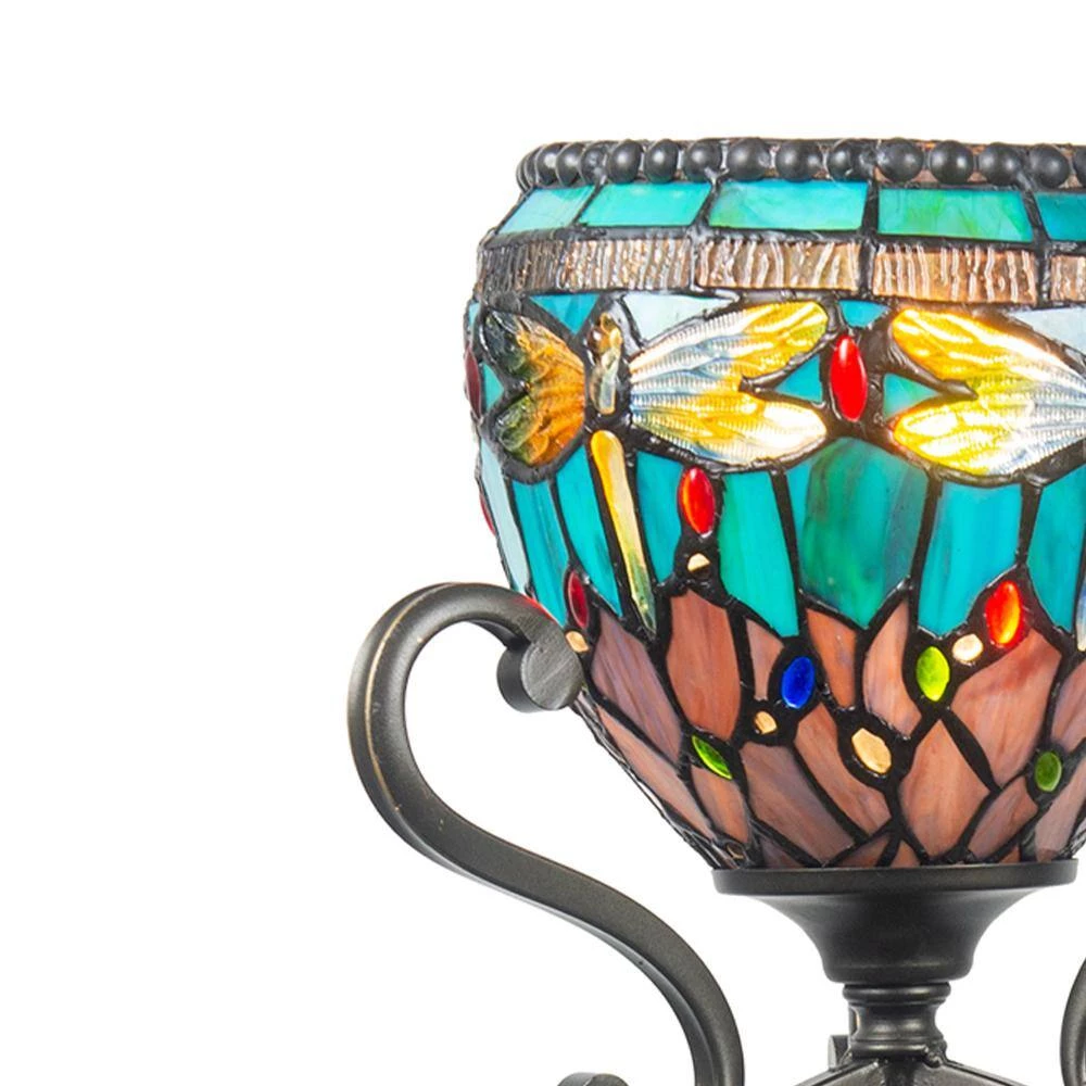 Our Briar Dragonfly Blue Tiffany Buffet Lamp is a dazzling combination of color and texture that will stand out in any room in your home. The stately fixture features a uplit shade that is crafted of slate shaped pieces of art glass in bright blue and warm amber. A horizontal row of Tiffany’s signature dragonflies is set wingtip to wingtip around the circumference. Each features shimmery iridescent bodies and wings with glass gem eyes. We added art glass gems and jewels in complementary tones throughout for added color and sparkle. The base is finished in Golden Antique Bronze and features a dual level pedestal with reeding detail surrounding the center column.