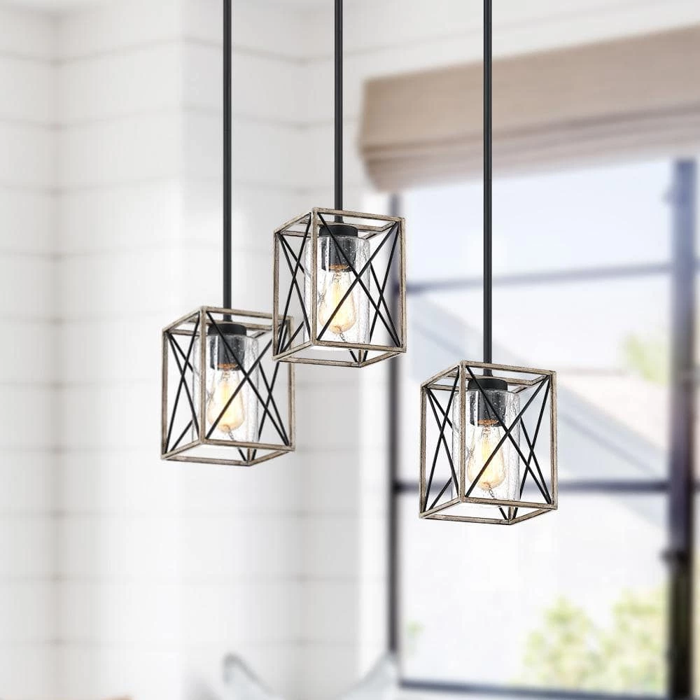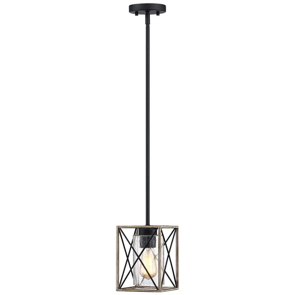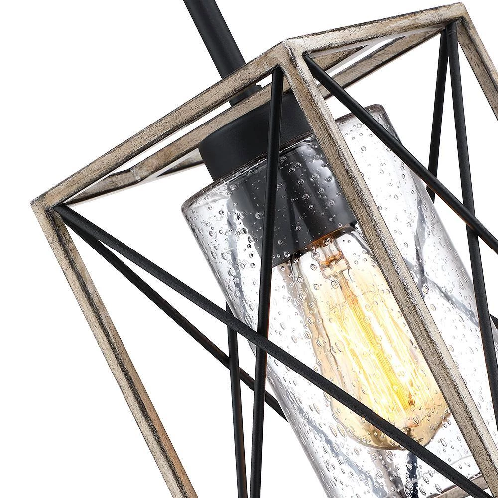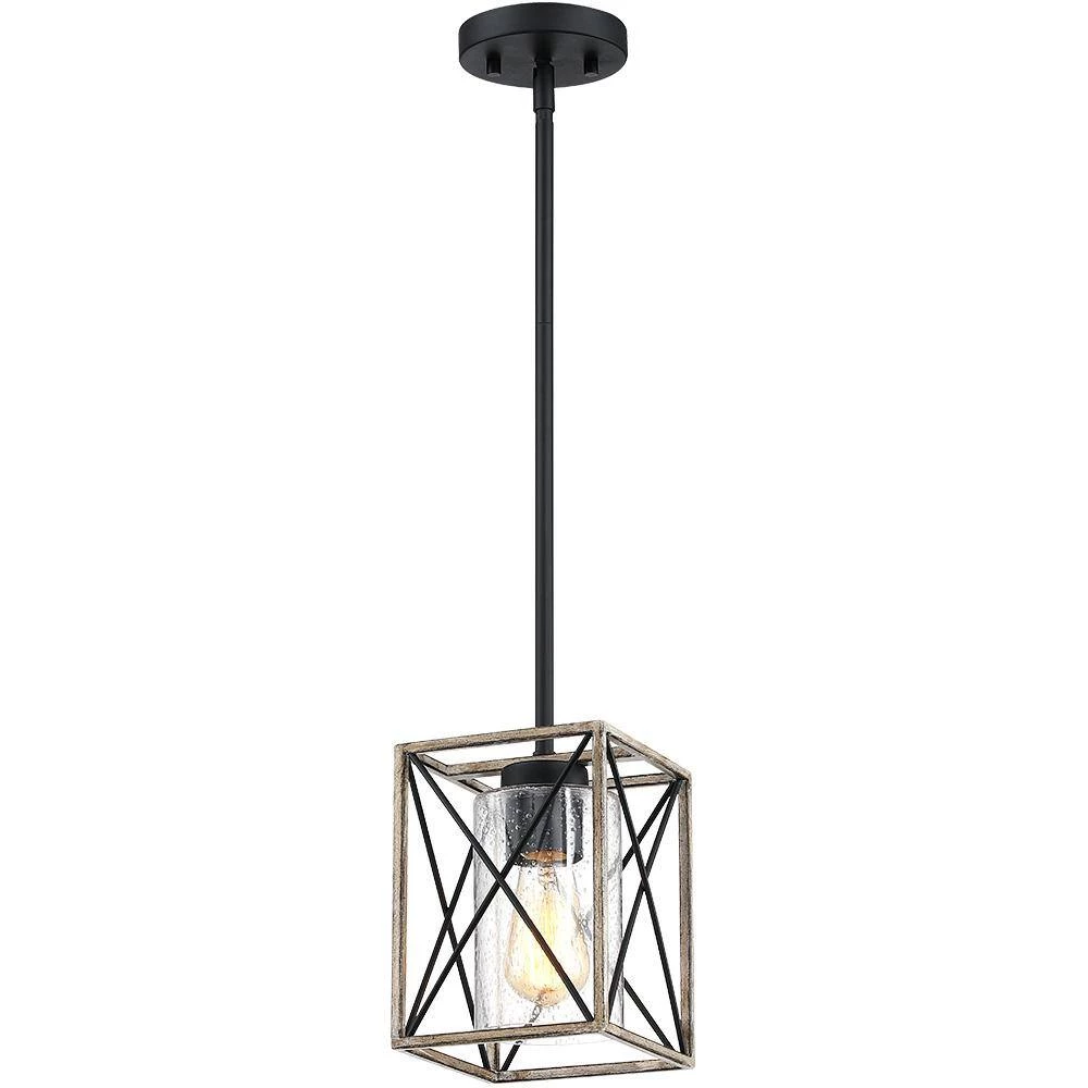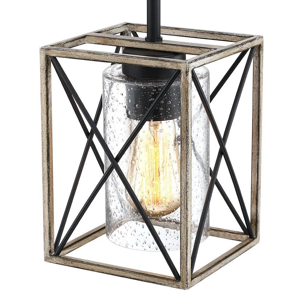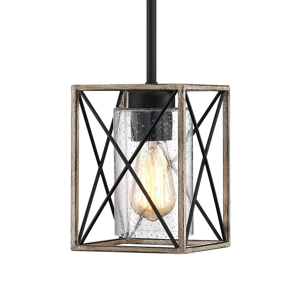 The rustic black 1 light pendant light by True Fine is inspired from the modern farmhouse trend that beautifully blends rustic, urban industrial, vintage and traditional elements. The open-caged ceiling light fixture features a faux-wood X-brace frame with a seeded glass shade. Vintage style Edison bulb (not included) is recommended farmhouse-industrial style pendant light fixture which is an ideal selection for over your kitchen island, dining room, your hall way or foyer, or suspended above you breakfast bar, or table of any kind