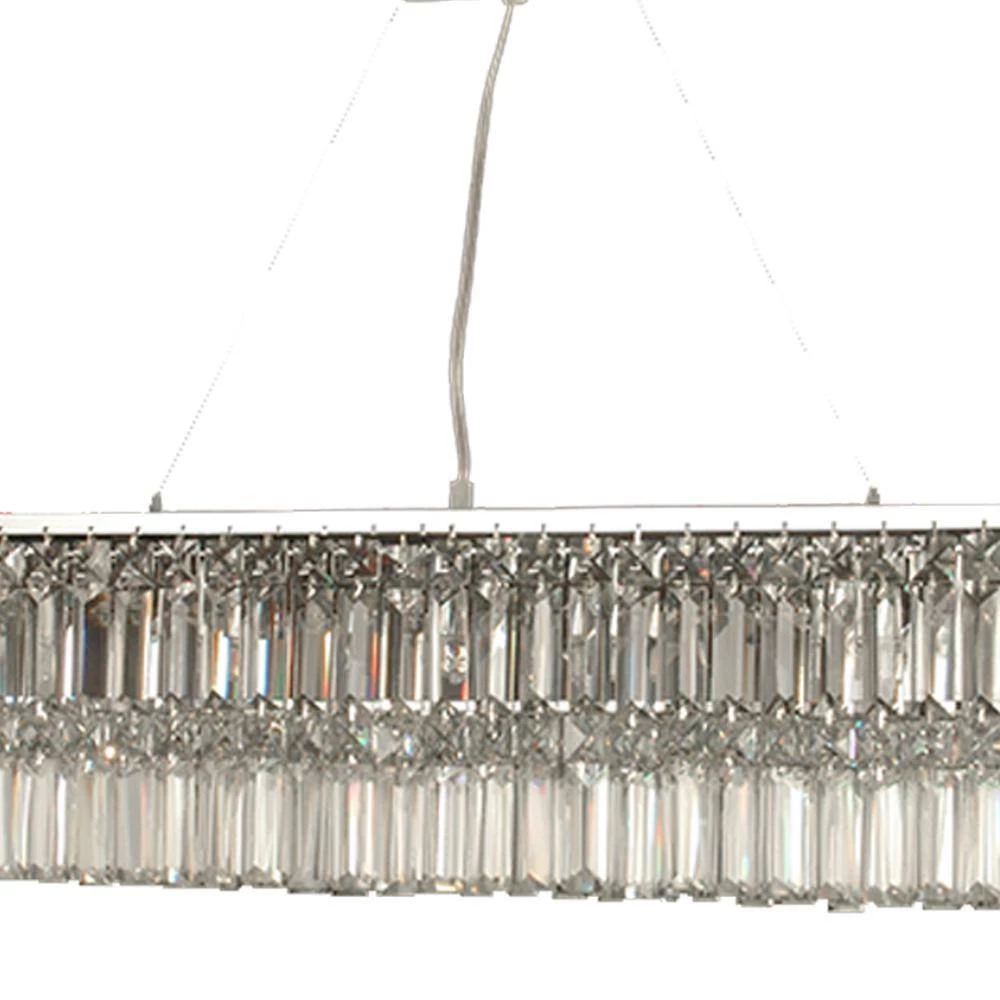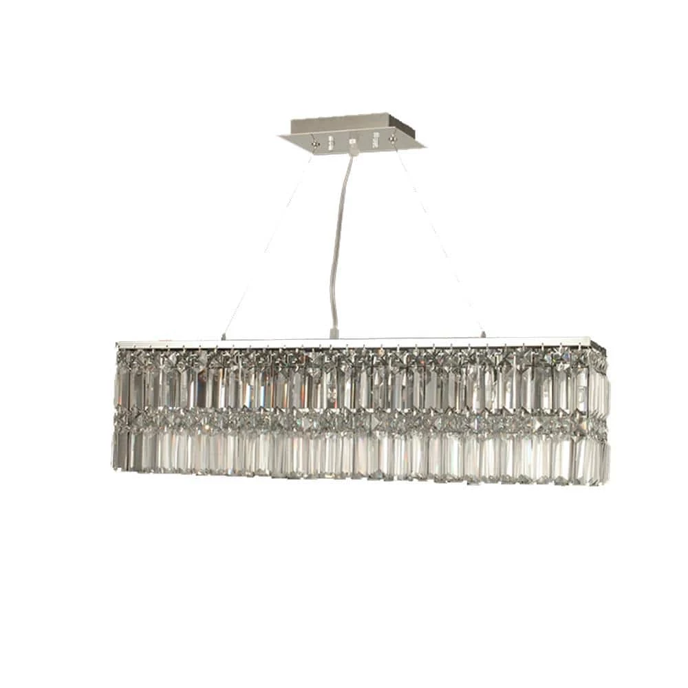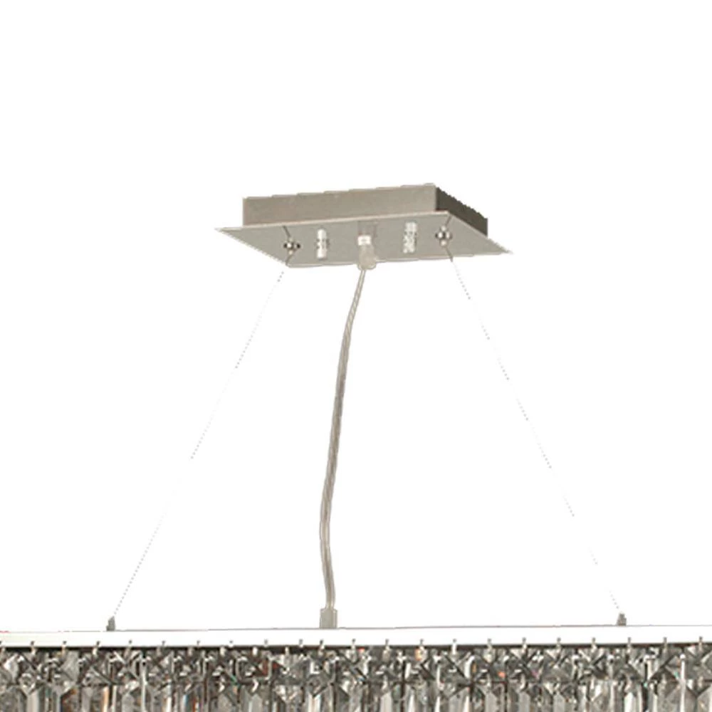 Chic and ultramodern, our Canley Chandelier will instantly upgrade any decor in your home. This elongated, rectangular fixture features a metal base that is finished in gleaming polished chrome. A double series of elongated crystal baguettes hangs from the base. The baguettes surround a series of six 40-Watt bulbs (not included) which is designed to create maximum light refraction when Canley is illuminated, casting shower upon shower of sparkles about the room. Canley hangs elegantly from a rectangular metal canopy, center support tube and side supports. The perfect fixture over a modern dining area; be prepared to win rave reviews from your family and friends when you choose our Canley Chandelier for your home.