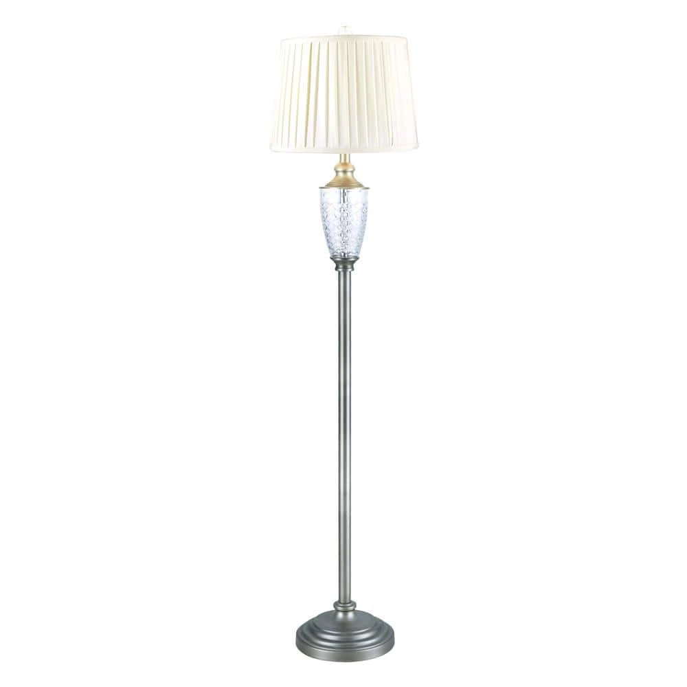 Our Castle Mountains 24% Lead Crystal Floor Lamp is a contemporary blend of fire and ice that easily assimilates into any decor in your home or office. The stately fixture features a metal base is finished in cool Antique Nickel. The base features a sleek center column, graduated round pedestal base and matching vase cap. A 24% led crystal taper sits at the top of the center column. The crystal is faceted in a meticulous all over pattern that will cast a fiery shower of sparkles about the room when the lamp is illuminated. We topped Castle Mountains with a fabric drum shade and added a solid crystal orb finial to complete the look. A bright choice next to a favorite reading area or bedside, our Castle Mountains 24% Lead Crystal Floor Lamp delivers both form and function to provide your family with many-years of artistically reliable lighting. Dale Tiffany SGF17178F Castle Mountains 24% Lead Crystal Floor Lamp.