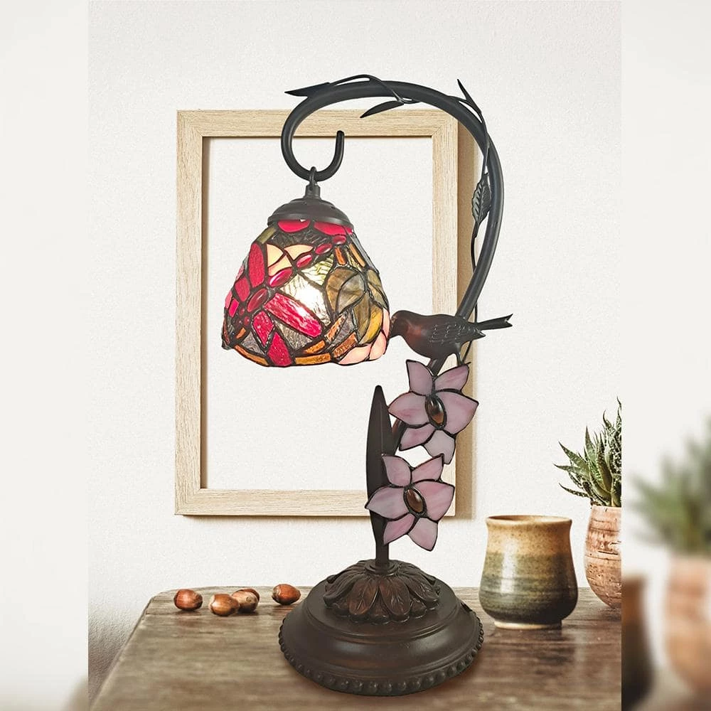 This beautiful Cypress Bird Tiffany Accent Lamp adds a colorful touch of springtime to any room in your home or office. The pretty fixture features a finely cast metal stepped pedestal base that is finished in Antique Bronze. The center column is a gracefully arched tree branch, complete with 3-dimensional mauve flowers and die cut leaves dotted with art glass gems at their centers. A delightful little bluebird is perched just above the flowers, which adds a whimsical touch. Hanging from the branch’s top end, a dome shade crafted in a floral vine pattern in bright, tropical hues adds a bright splash of color when the lamp is lit. An easy way to add a bright pop of color on a bookcase, mantle, or curio shelf, our Cypress Bird Tiffany Accent Lamp also makes a wonderful gift for any occasion or recipient. NOTE: Due to the nature of handmade art glass, colors, sizes and patterns may vary slightly.