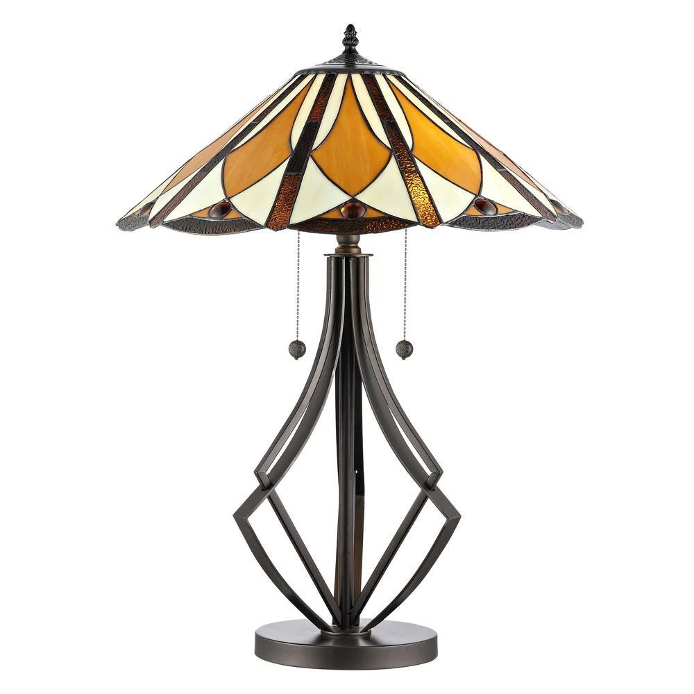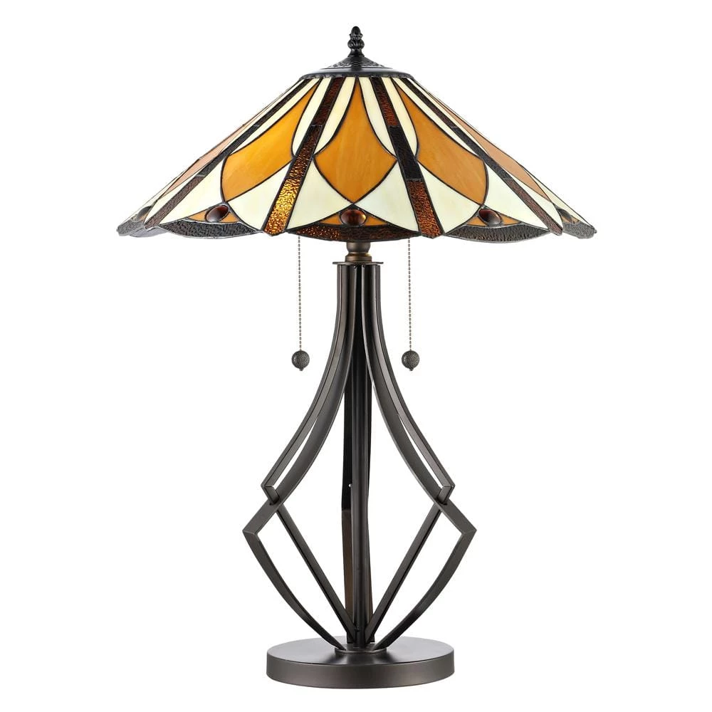 Our warm Diamond Flare Tiffany Table Lamp is a lovely combination of contemporary style and Arts and Crafts inspiration that will easily enhance any decor in your home or office. The generously sized conical shade features a lovely all-over diamond pattern in variegated amber tones with vertical stripes of dark amber. Each glass is hand rolled and individually copper foiled, using the technique first developed by L.C. Tiffany in the late 19-century. Because of this, please allow for small variations in color. The metal base, finished in Tiffany Bronze, features diamond shape side supports surrounding the center column. A lovely choice in dens or bedrooms, our Diamond Flare Tiffany Table Lamp also makes a wonderful work lamp on larger workstations.