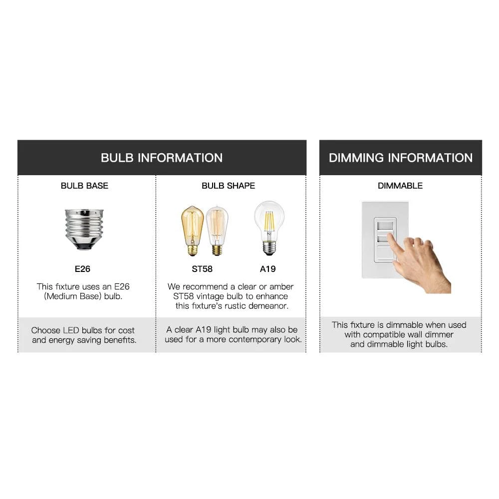 - E26 medium base socket, (1) 60-Watt MAX, ST58 vintage Edison bulb suggested(bulb not included) to enhance the rustic look, change the bulb, change the look