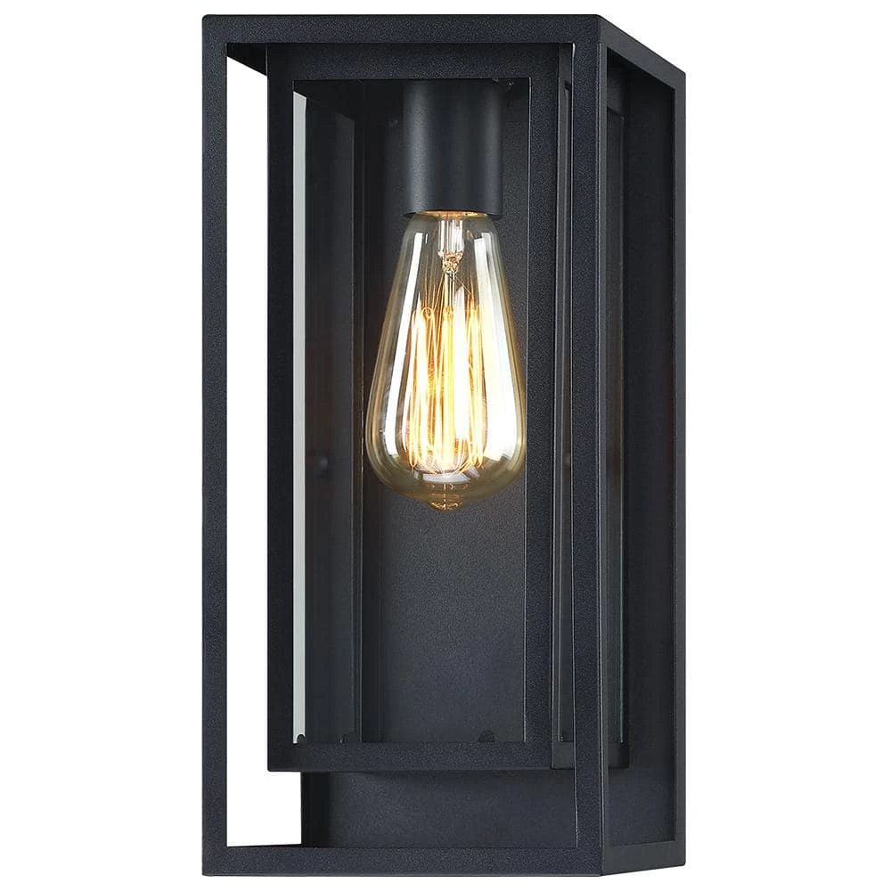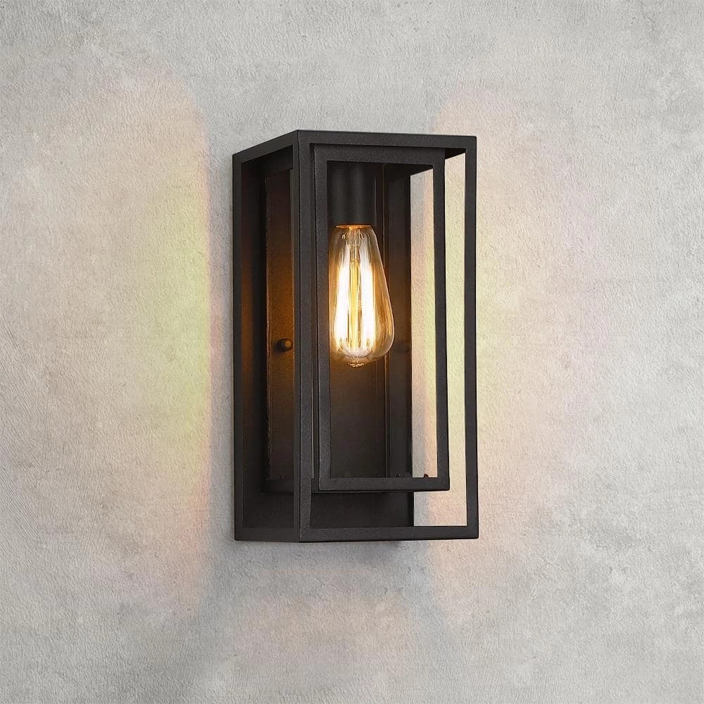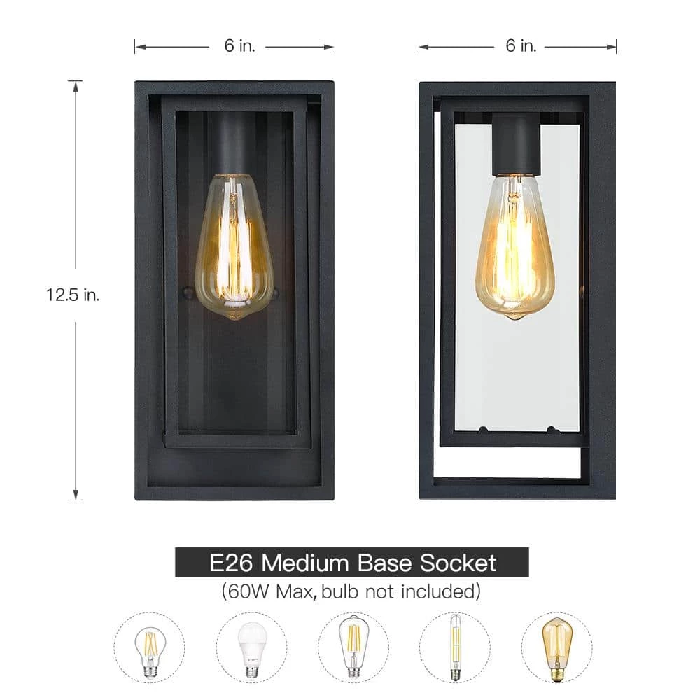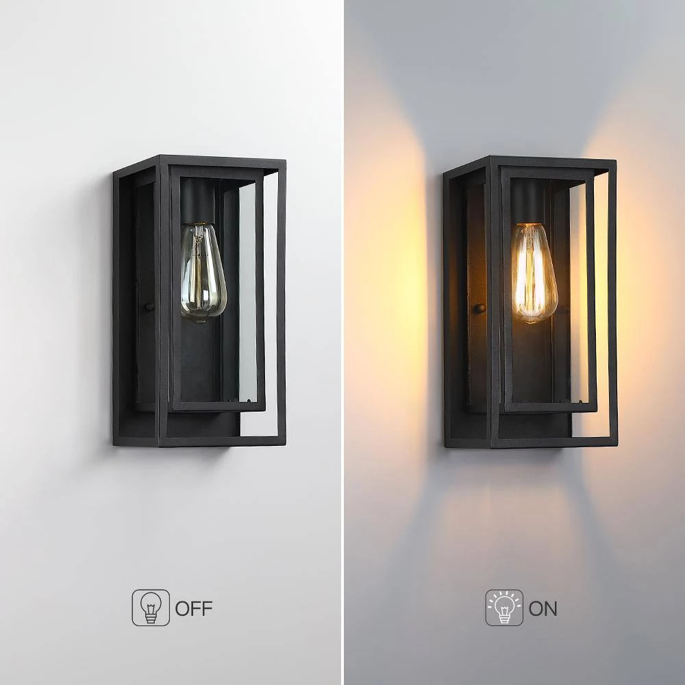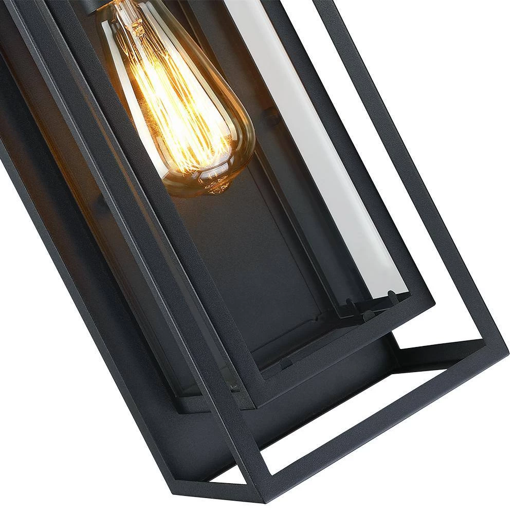 This modern rustic Exterior lantern lighting fixture features long rectangular shaped double box, with inner frame enclosed by 4 clear glass panels. The powder-coated black and sleek clean-lined framework complete the look. Pairing the transitional design with a vintage bulb is recommended to fully illuminate the glass and complement the overall aesthetic. Ideal for Front Porch, Patio, Garage, Deck, Balcony etc.