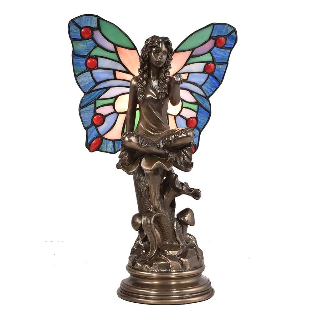 Our beautiful Fairy Tiffany Lamp does double duty as both functional light fixture and illuminated work of art. The pretty fixture features a meticulously cast base that is finished in Bronze Cold Cast that depicts an angelic fairy standing in a wooded scene. Her ruffled dress and facial features are extremely lifelike. The fixtures shade is depicted by her set of wings in vivid shades of blue, pink, green and mauve with art glass gems in red added throughout for added color and sparkle. Each glass-piece is hand rolled and individually copper foiled. Please allow for a slight variation in color and texture. Perfectly sized to add a bright pop of color to curio shelves, mantles or bookcases, our Fairy Tiffany Lamp also makes a delightful gift for any occasion. NOTE: Due to the nature of handmade art glass, colors, sizes and patterns may vary slightly.