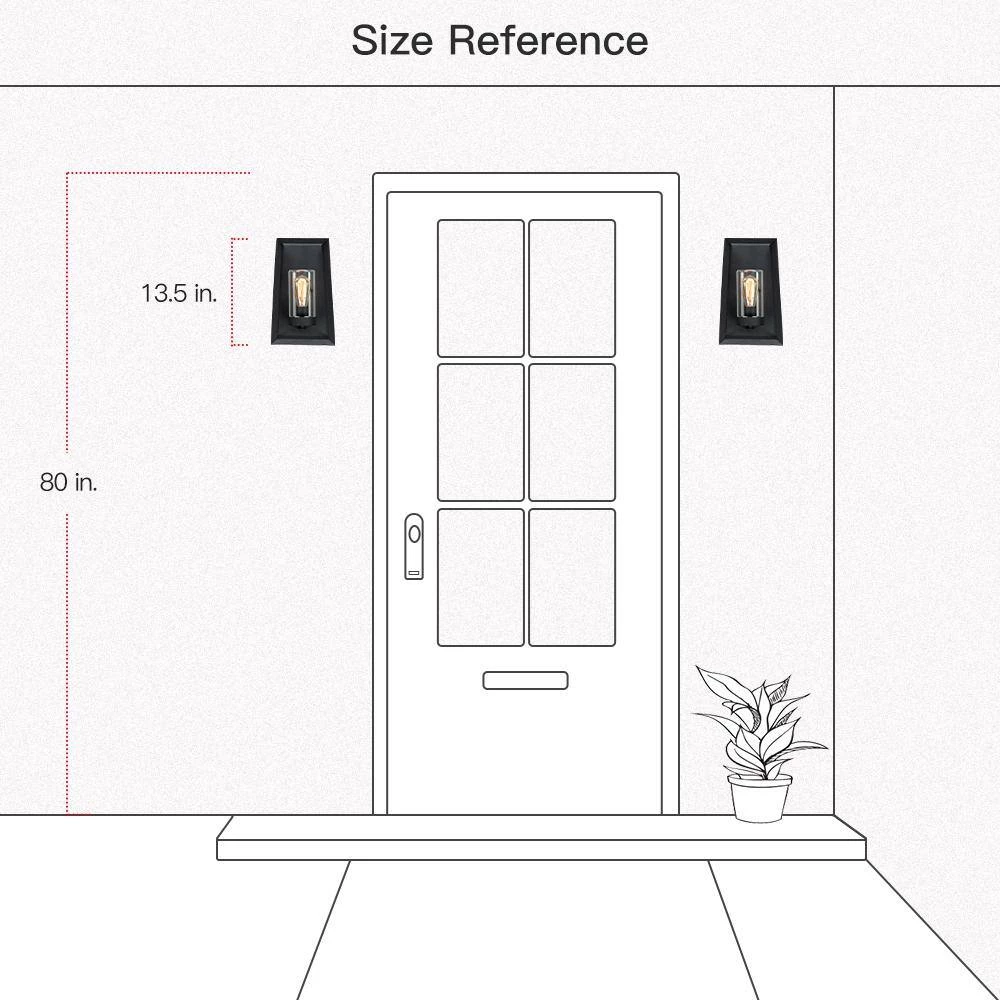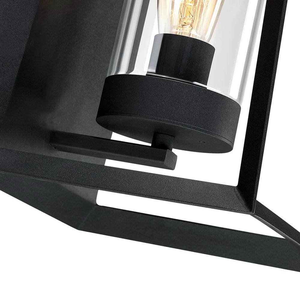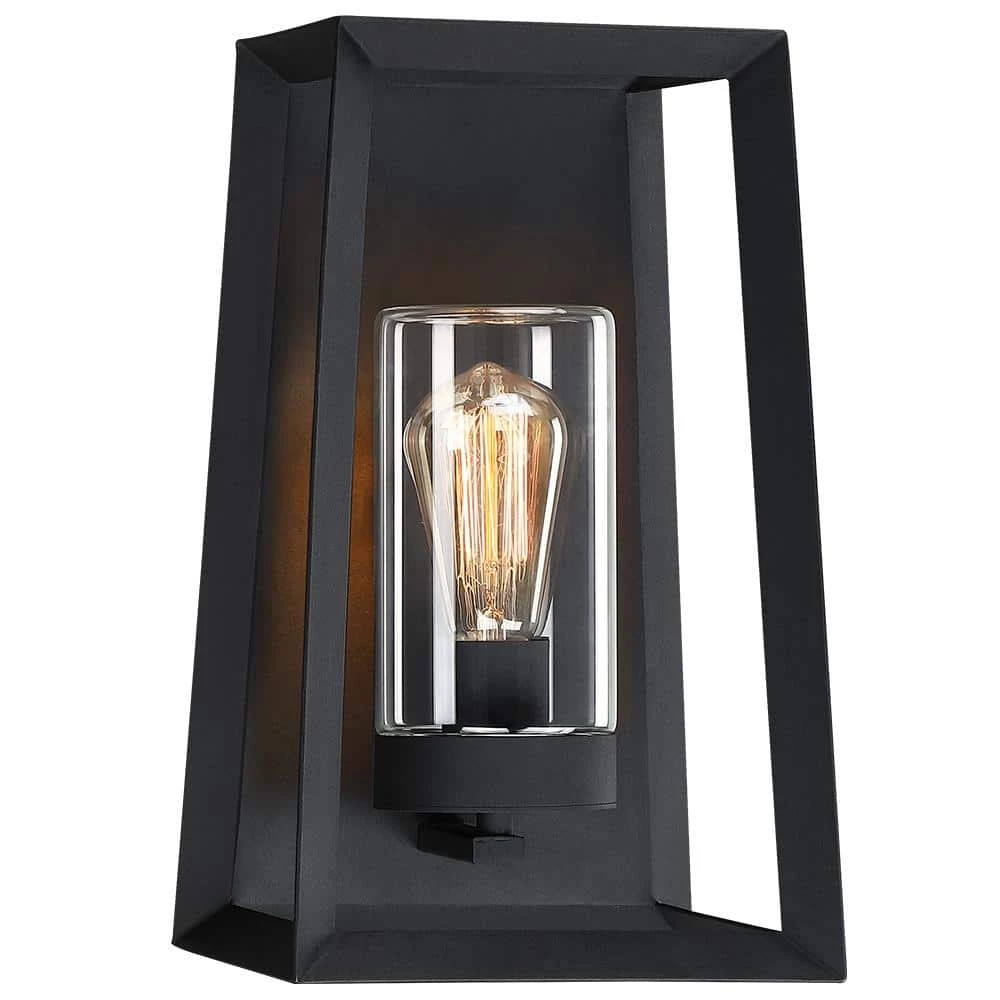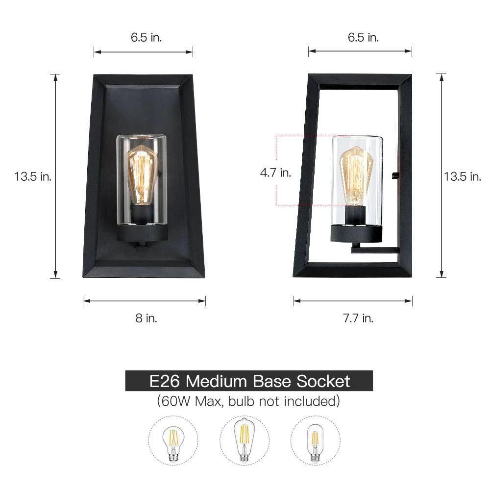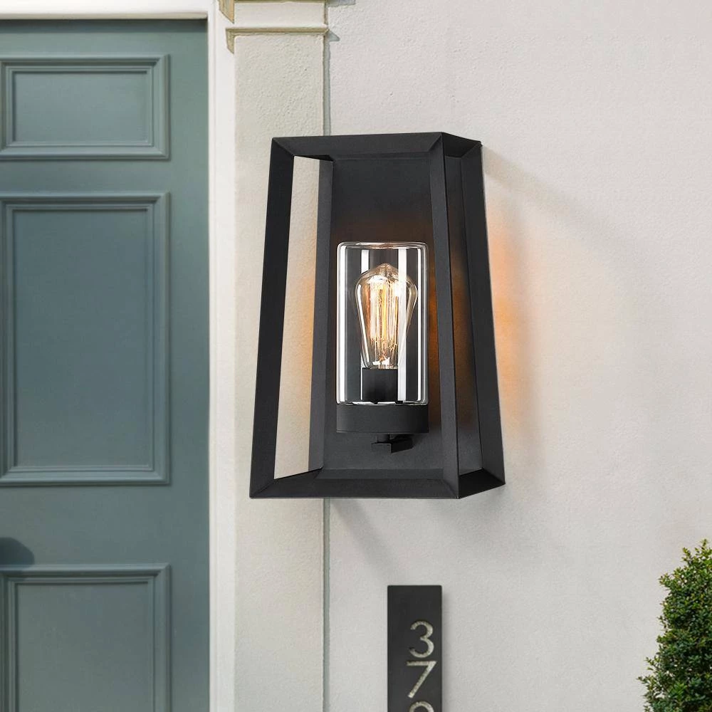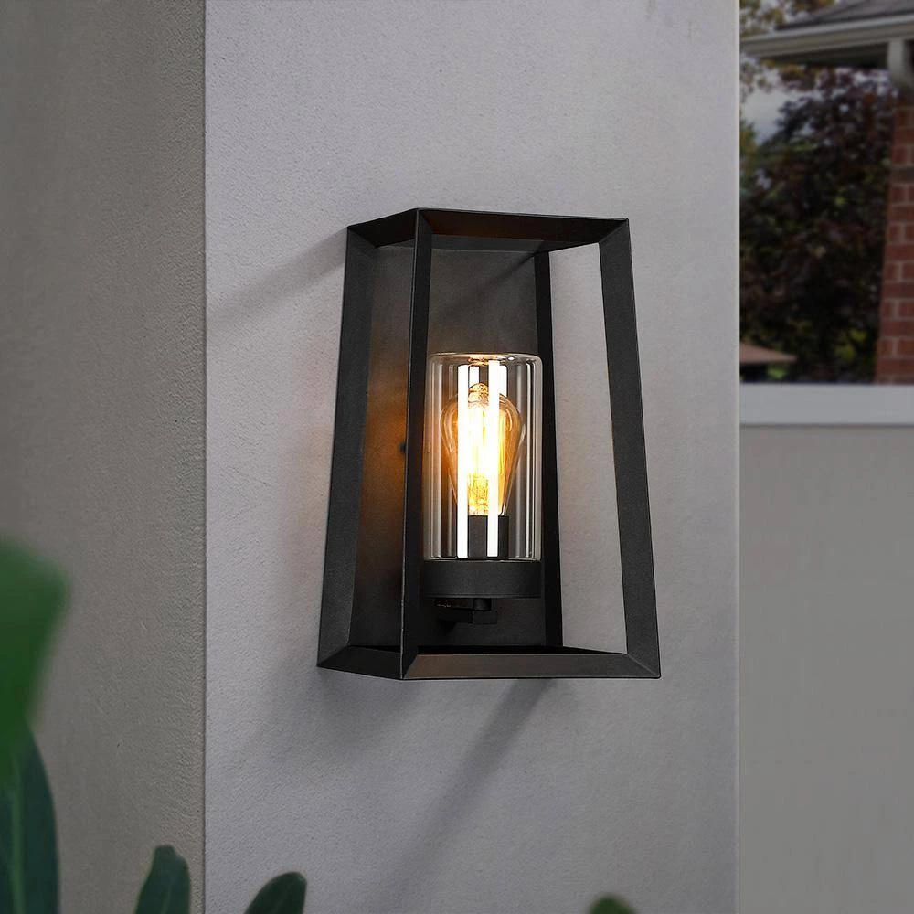 This industrial modern chic exterior lantern lighting fixture features a powder coated black statement Trapezium thick metal frame with closed clear glass cylinder. Pairing the transitional outdoor wall light with a vintage bulb(not included) is recommended to fully illuminate the glass which spreads a warm and inviting glow. Ideal for Front Porch, Patio, Garage, Deck, Balcony etc.
