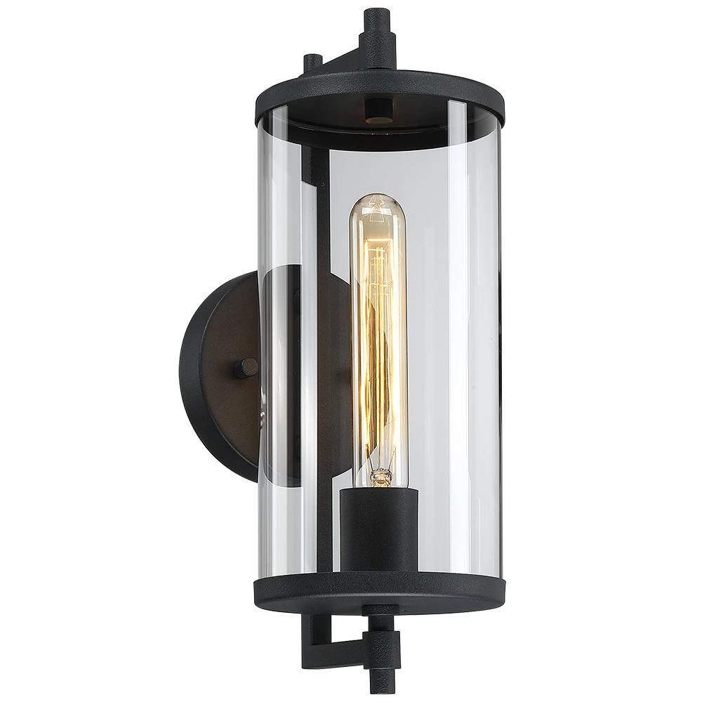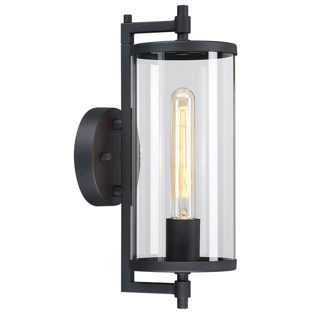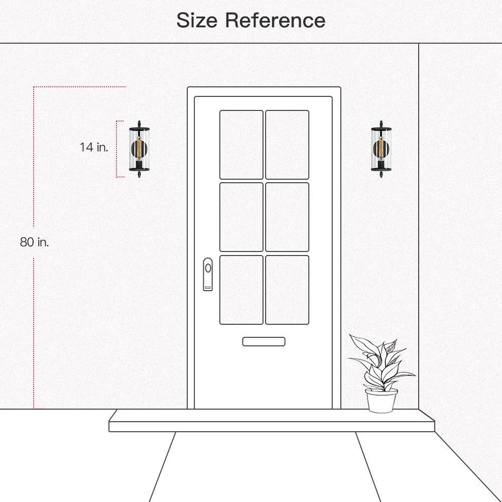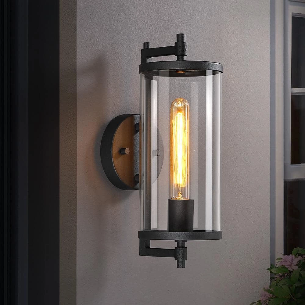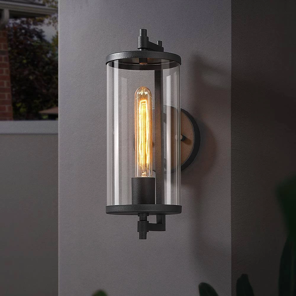 This modern farmhouse style wall-mount lantern light is made of rust resistant metal, featuring textured black finish and clear glass cylinder shade. Its concise and easy-to-match design easily blend in with outdoor surroundings. It would also works well as a medium-sized indoor wall sconce light in bathroom, kitchen, bedroom and hallway, goes well with farmhouse, contemporary, industrial or transitional styles
