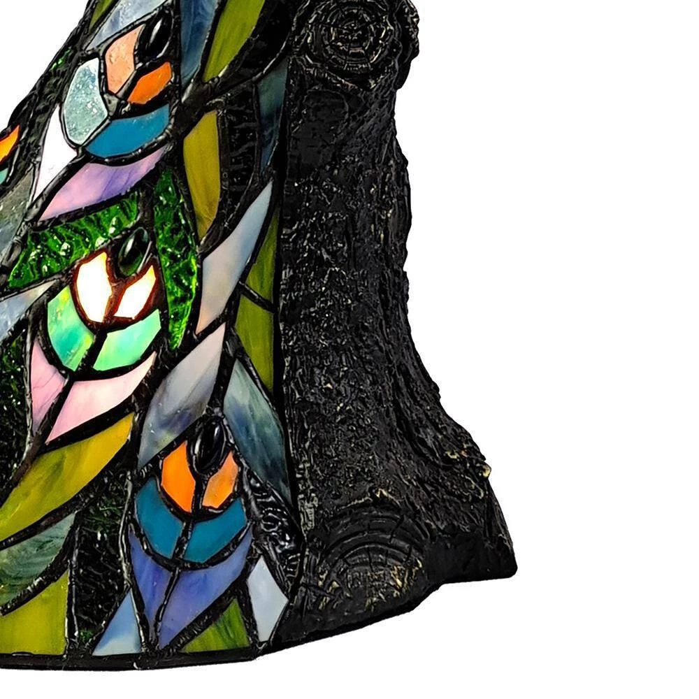 - Echoing the feather pattern and the rich colors of the peacock’s plumage, this lamp is created of vibrantly-hued authentic art glass