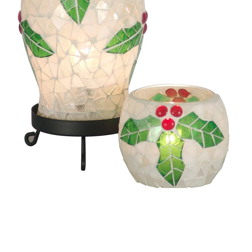 Our Holly Noel Accent Lamp set will add an extra special touch to your festive Holiday decor. The accent lamp features a hurricane style shade, hand covered in a mosaic pattern of snow-white art glass. A series of 4 clusters of bright green holly leaves, gathered around bright red berries wrap around the shade’s circumference. The shade sits atop a metal stand with curved feet. The set includes a matching votive holder featuring 2 groupings of holly leaves and berries. Our Holly Noel Accent Lamp set makes an excellent gift, whether for yourself or anyone who loves the yuletide season that will be sure to spread warmth and cheer for many holidays to come.