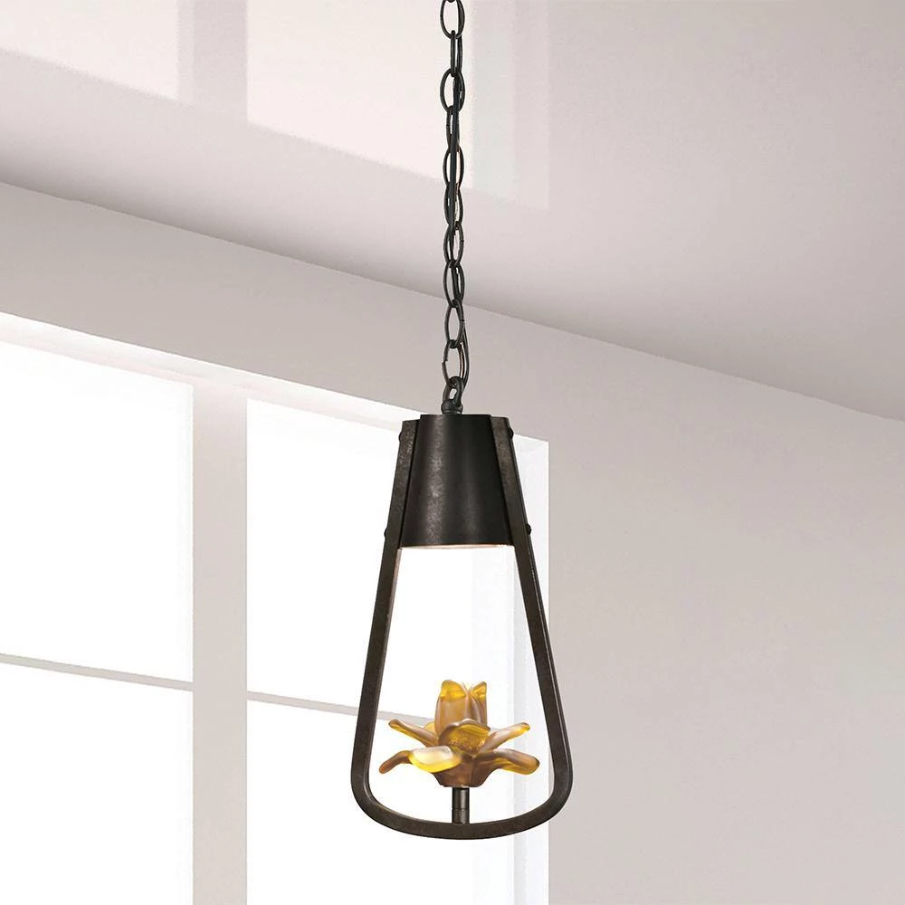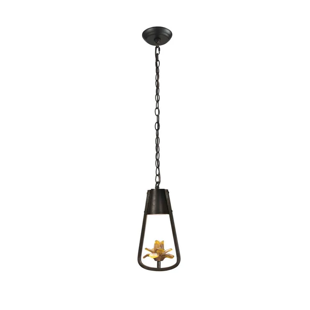 Turn of the century style is blended with state of the art technology in this incomparable Jeeves LED Mini Pendant. The open metal base is reminiscent of a vintage incandescent light bulb and is finished in rich antique bronze. At the base, an amber glass bulb cover is handcrafted in the shape of a pretty spring blossom, which will glow warmly when lit and adds a gentle natural touch to the industrial feel of the pendant. Jeeves hangs beautifully from a metal ceiling canopy and wire cable/chain, which are finished in matching antique bronze.