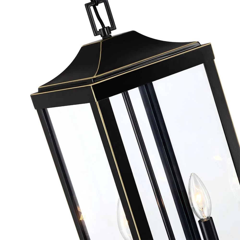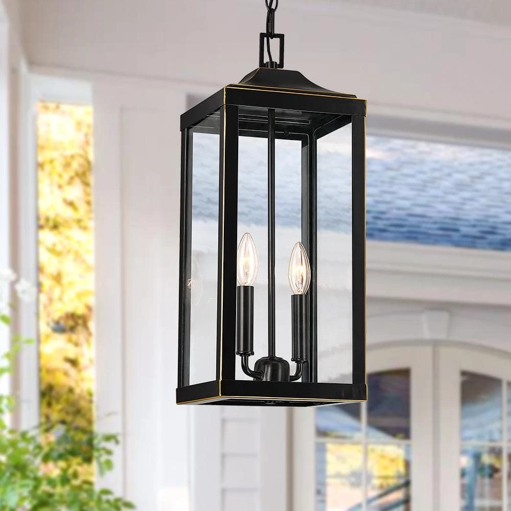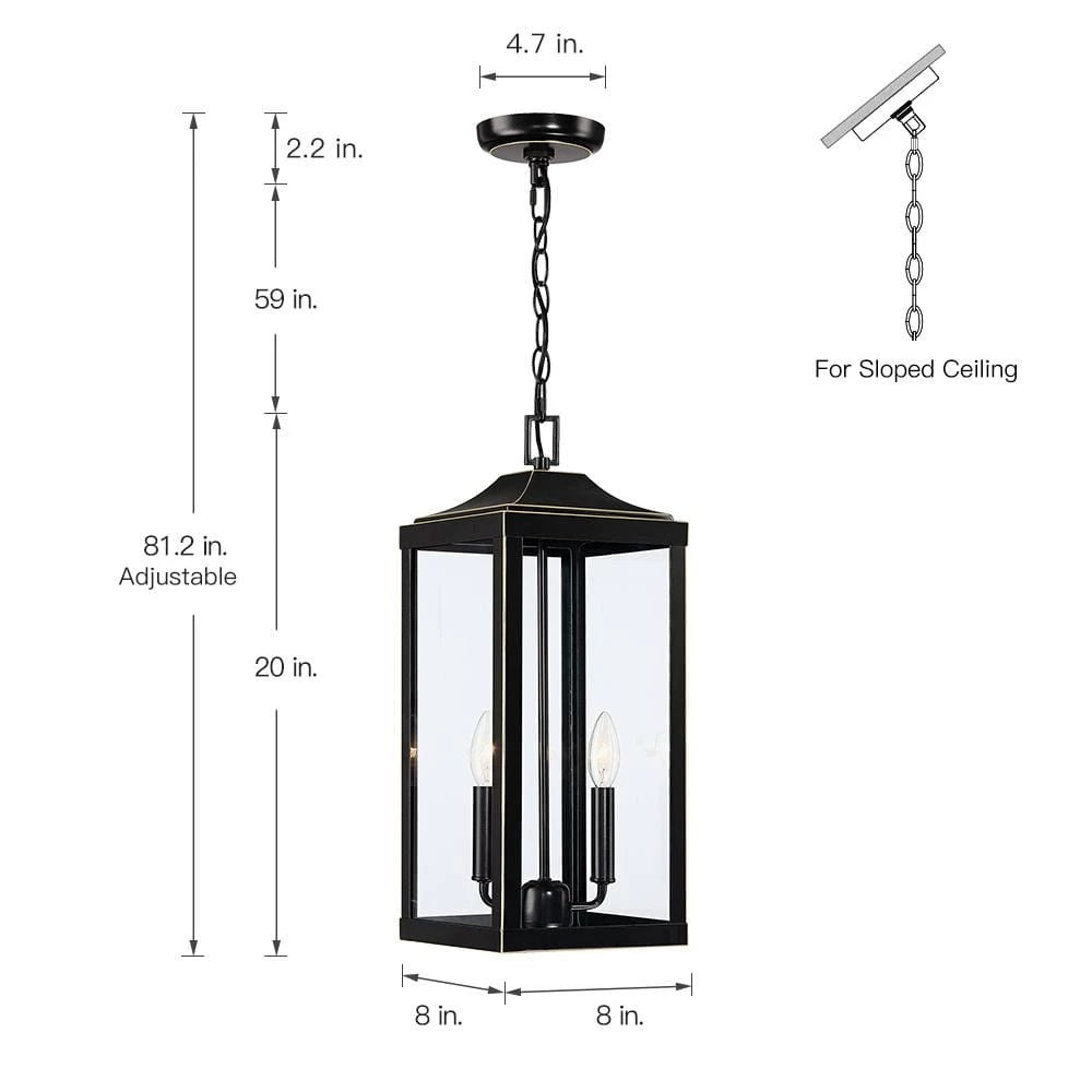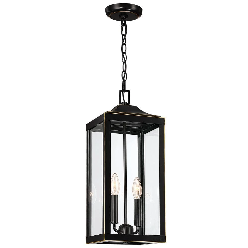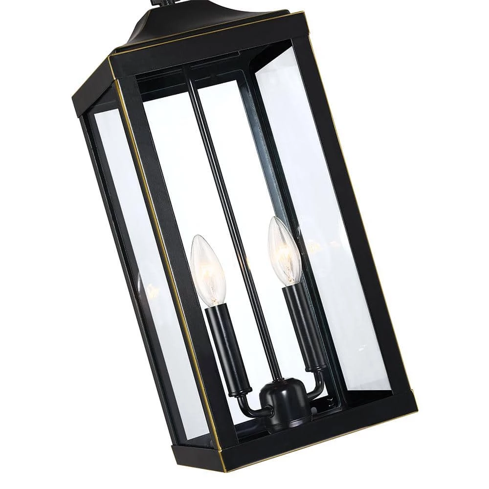 Illuminate your front door porch entryways and backyard patios with this transitional 2-light outdoor classic new traditional Exterior hanging lantern lighting fixture. It’s rated wet locations and its sleek frame is made from metal in a bronze with gold highlights finish that complements your decor classic to rustic. It features 4 clear glass panels with its long rectangular shape enclosed in a bronze and sleek clean-lined framework. The fixtures bottom is open to offer directional lighting as well as easy access to change the bulbs. Pairing the modern design with Candelabra Base bulbs is recommended to fully illuminate the glass and complement the overall aesthetic. Ideal outdoor pendant light for Front Porch, Patio, Deck, entryway, pergola or foyer etc.