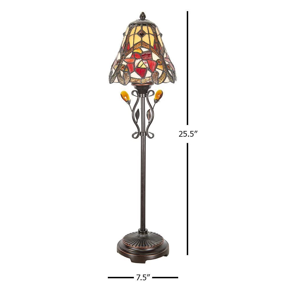 This vibrant Jeweled Vine Tiffany Buffet Lamp is a welcome addition to any room’s decor. The tall fixture features a deep cone shade that is crafted of art glass. The background color is sunny light amber panels that are set in a grid fashion. A bold brownish amber vine wraps itself all over the shade and around deep scarlet florals that are set against a crisp white background. We added art glass gems in bright amber throughout and jewels in scarlet near the top of the shade for added color, texture, and sparkle when the lamp is illuminated. The finely cast base is finished in burnished Golden Antique Bronze which features a footed round pedestal with reeding detail around the base of the sleek center column.